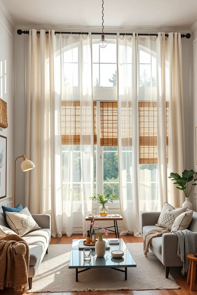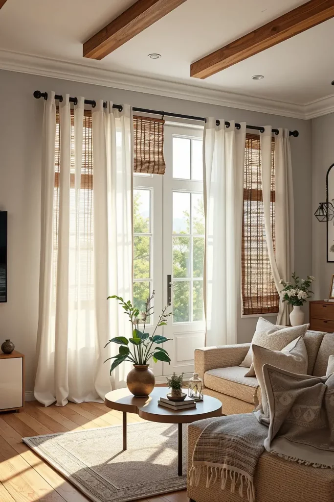 In my area, I have white semi-sheer curtains that hang down to the floor, decorated with black matte rods to offer a bit of contrast. When there is a breeze, the curtains move and paint the room with changing patterns of light. To complete the room, I add woven wood shades that I pull down in the evenings to provide privacy and don’t affect the style of the place. Having several layers of windows coverings helps the look be both stylish and useful.