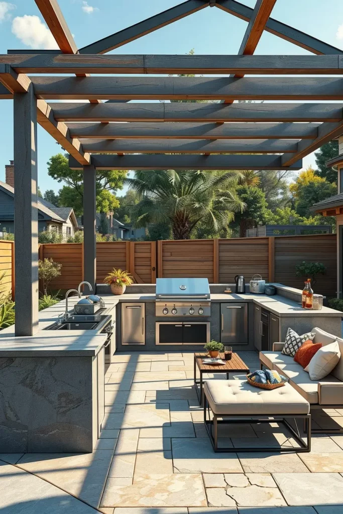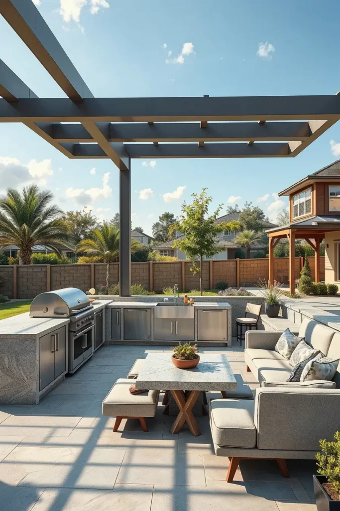 Personally, I believe a pergola transforms a simple grill into a defined destination. Many US-based outdoor design experts recommend thinking of the backyard as an extension of interior living zones, and I consistently apply this principle. By framing the grill area architecturally, the space feels intentional and elevated, not improvised.