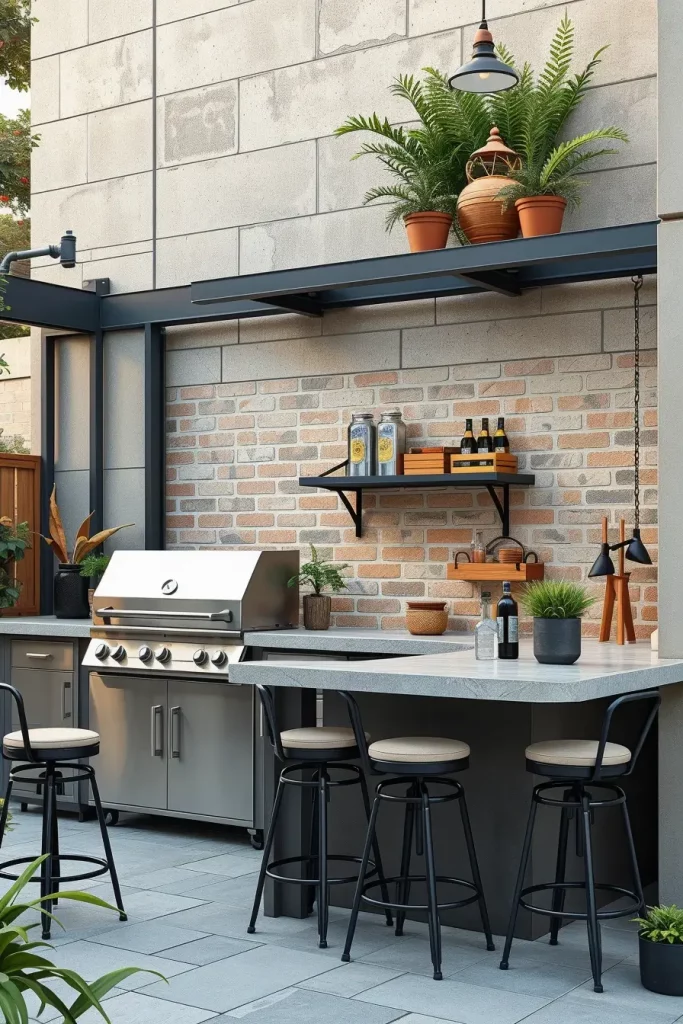 Industrial-chic aesthetics bring a bold and contemporary edge to outside barbecue area ideas 2026. I design these spaces with exposed metal frames, concrete surfaces, and dark-toned finishes that create a slightly urban character. The grill becomes part of a larger composition that feels structured and raw yet controlled.