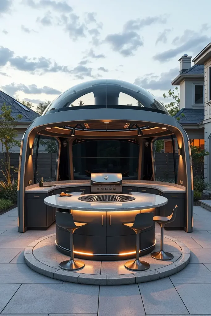 For clients seeking something bold and designer, I suggest futuristic cooking pods or enclosed grill domes. These unique structures redefine the idea of outside barbecue areas by creating a fully immersive cooking environment. Typically constructed from powder-coated steel, glass panels, or concrete composites, these pods function as sculptural focal points in the backyard. In 2026, I see more smart-technology integration—ventilation systems, LED perimeter lighting, and automated grill controls.