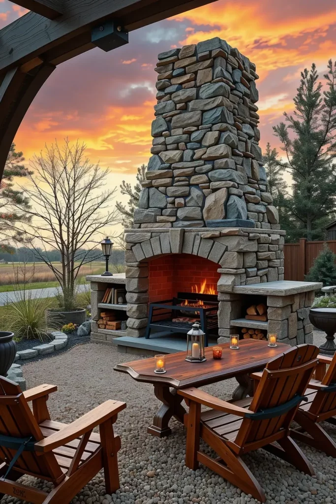 I typically build the fireplace from natural fieldstone or stacked limestone with a raised hearth that doubles as seating. A heavy iron grill grate and wood storage niches are integrated into the structure. Surrounding furniture often includes solid wood benches, Adirondack chairs, and a large reclaimed wood dining table. I also add lantern-style lighting and gravel or flagstone flooring for drainage and durability.
