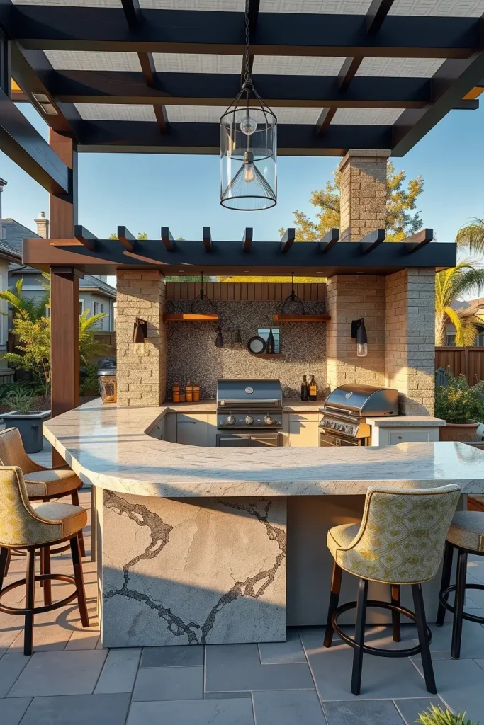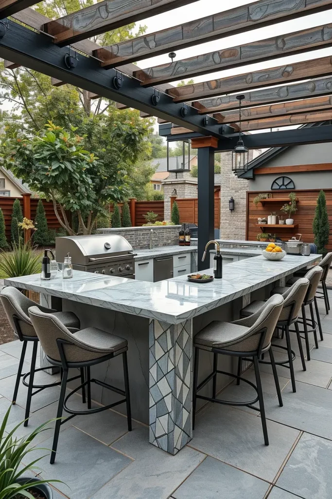 When I design a stylish and creative barbecue area, I frequently center it around a statement bar countertop. In outside barbecue area ideas 2026, countertops become the visual highlight—crafted from terrazzo, polished concrete, quartzite, or even custom tile mosaics. I see homeowners wanting bold patterns and unexpected materials that elevate the outdoor kitchen beyond functionality.