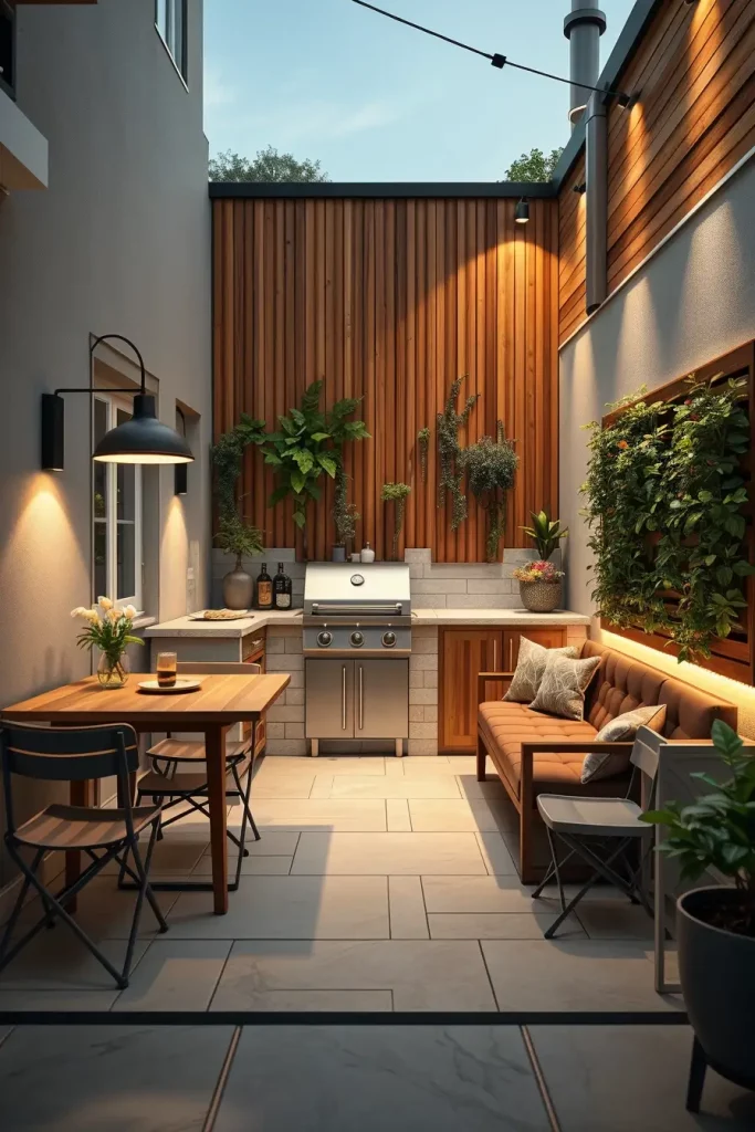 Small backyards require precision and creativity, especially in outside barbecue area ideas 2026 where homeowners want something artistic and highly functional. I approach compact spaces with vertical thinking—using walls for storage, greenery, and integrated lighting. The key is maximizing every square meter without overwhelming the area. A built-in corner grill station with slim countertops allows efficient use of space while maintaining a clean and modern appearance.