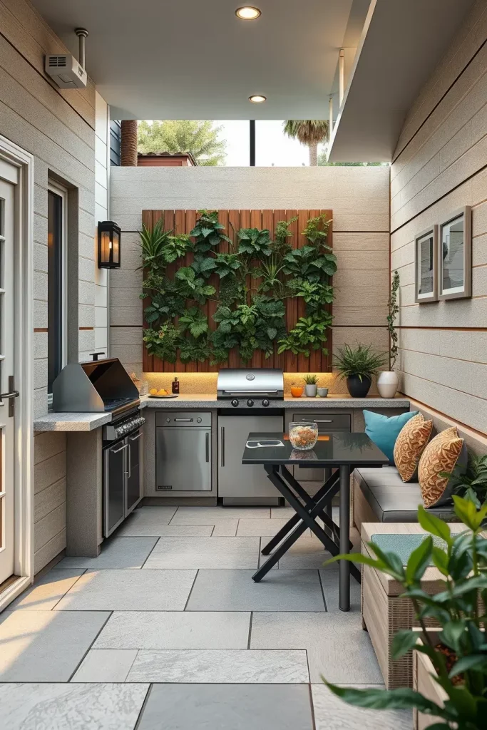 To complete this section properly, I would add a built-in storage solution hidden behind custom wooden shutters. Many designs overlook practical storage for grilling tools and tableware, and I consider this essential for maintaining a clean and polished courtyard aesthetic.
