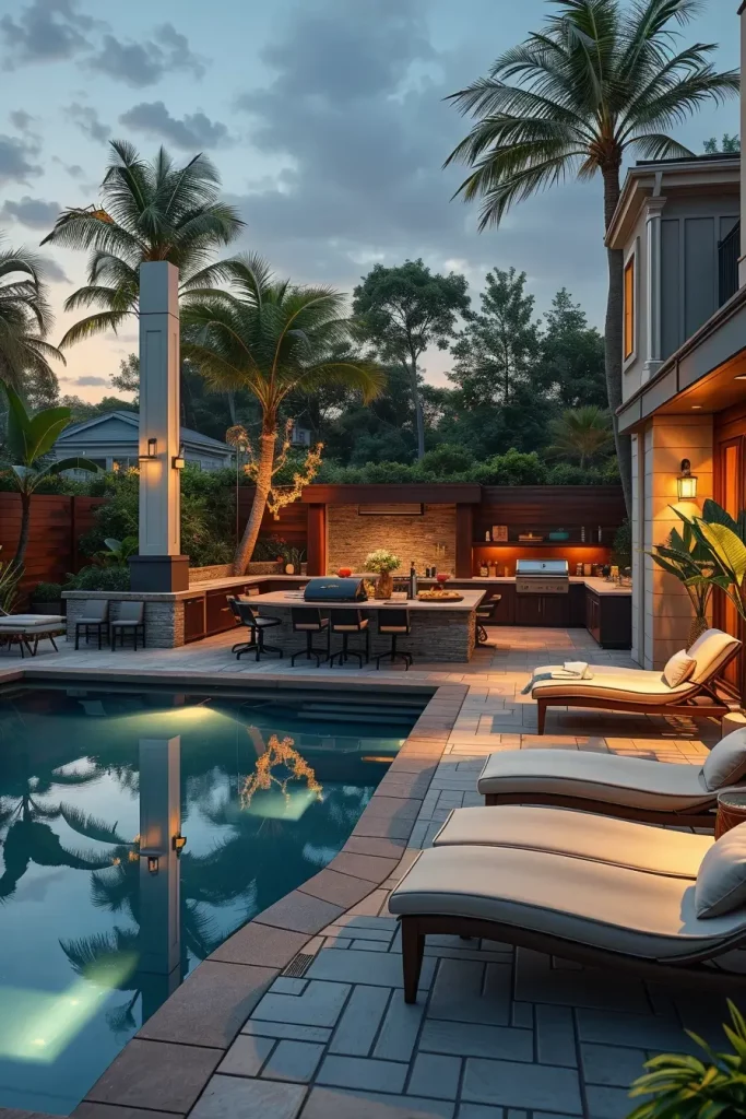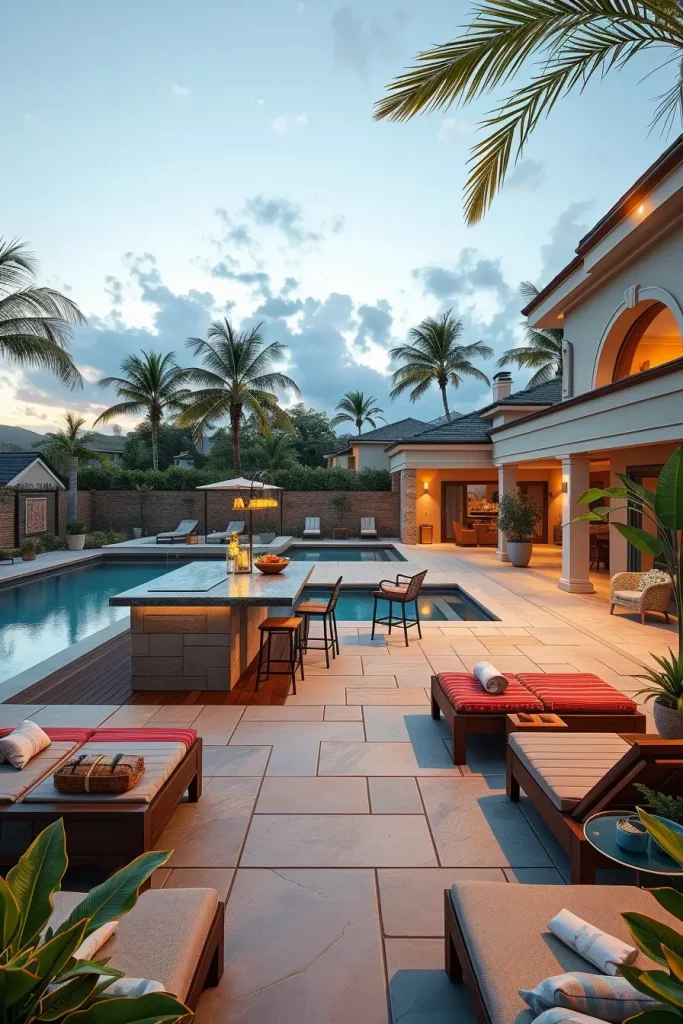 I incorporate a covered bar area with high stools, a built-in grill island, and an outdoor refrigerator for beverages. Lounge chairs with adjustable backs line the pool edge, while cabana-style daybeds add comfort and luxury. I always recommend performance fabrics that resist fading and moisture. Integrated outdoor speakers, subtle landscape lighting, and tropical greenery elevate the resort-like atmosphere.