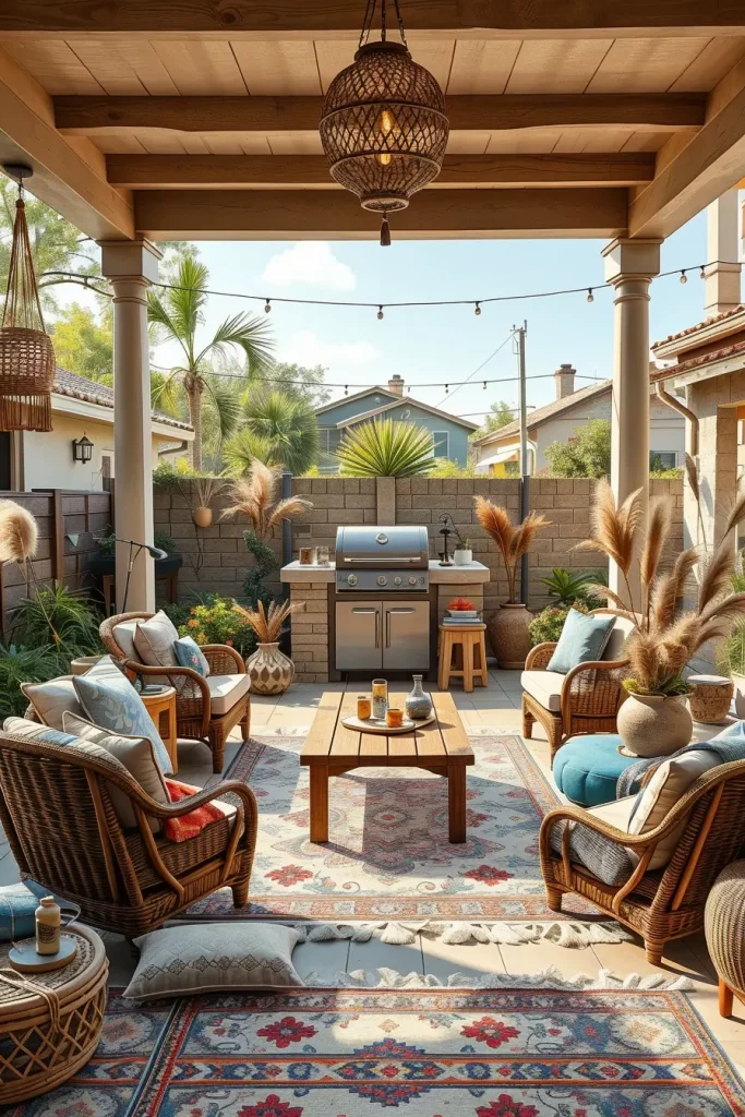 What is sometimes missing in boho spaces is structured lighting. I ensure there is a balance between decorative string lights and functional task lighting near the grill to maintain practicality.
