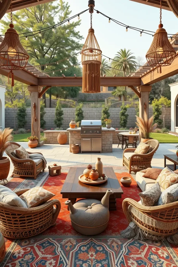 I include rattan lounge chairs, low wooden coffee tables, patterned outdoor rugs, and oversized floor cushions. Macramé details, woven pendant lights, and ceramic planters filled with ornamental grasses add softness. The grill island may feature handmade tiles or textured concrete for a slightly eclectic look. I focus on warm color palettes—sand, terracotta, muted greens—to create visual cohesion.