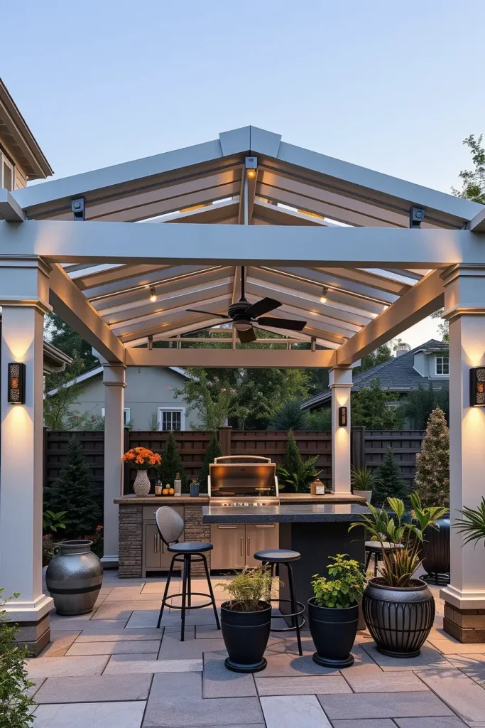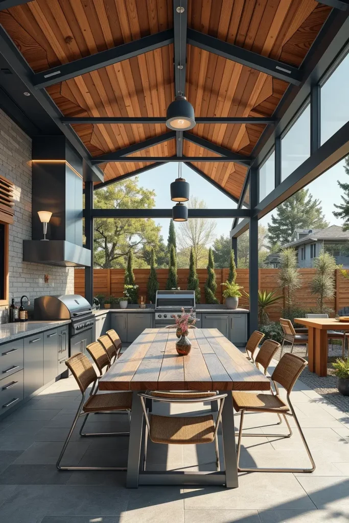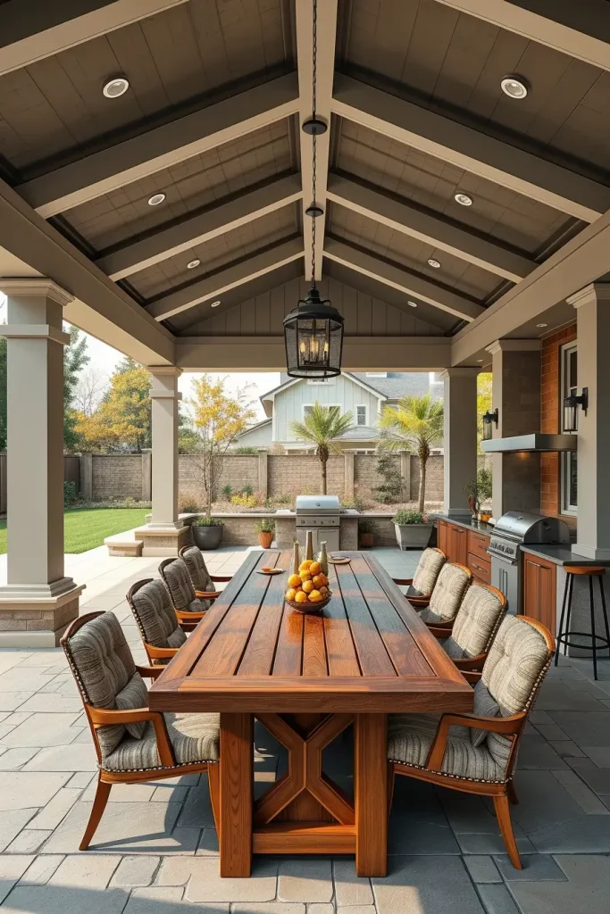 When I design luxury outdoor dining pavilions with integrated BBQ stations, I approach them as complete open-air rooms rather than simple cooking zones. In 2026, elevated outside barbecue area ideas 2026 focus on comfort, scale, and architectural cohesion. A pavilion structure with a solid roof, defined columns, and open sides creates a protected yet breathable environment. I carefully position the integrated BBQ station along one wall to maintain circulation and keep the dining table as the visual centerpiece. This layout ensures the host can cook and interact without disrupting the spatial flow.