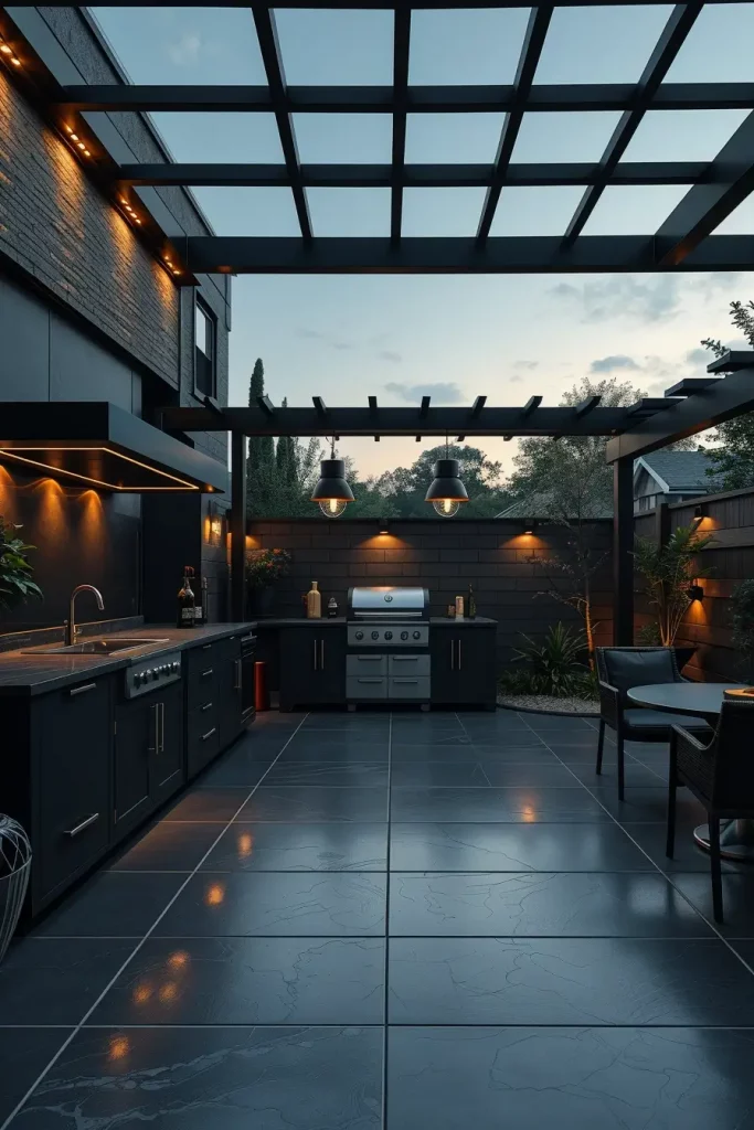 In 2026, one of the most striking outside barbecue area ideas 2026 I recommend is the black-on-black concept. I design the entire grill zone in layered matte and textured black finishes: charcoal porcelain slabs underfoot, powder-coated steel cabinetry, and a deep graphite pergola overhead. This approach creates a dramatic yet controlled environment where the grill becomes an architectural feature rather than a standalone appliance. I find that black unifies different materials and makes even compact patios feel intentional and refined.