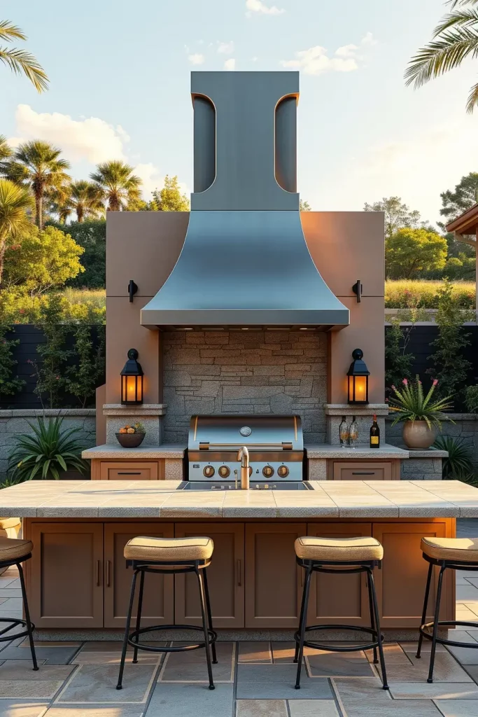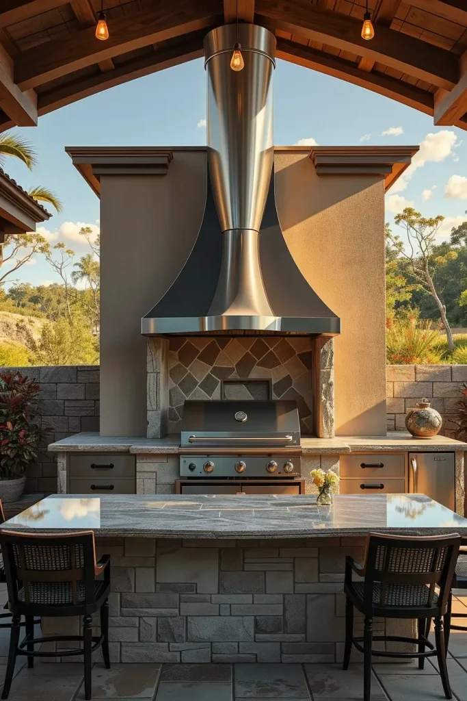 A truly designer outside barbecue area often features a sculptural chimney or hood that anchors the composition. Instead of hiding ventilation, I highlight it as a central architectural element. In my projects, I use oversized metal hoods, custom concrete forms, or even corten steel structures that develop a natural patina over time. These features give the grill zone vertical presence and visual authority.