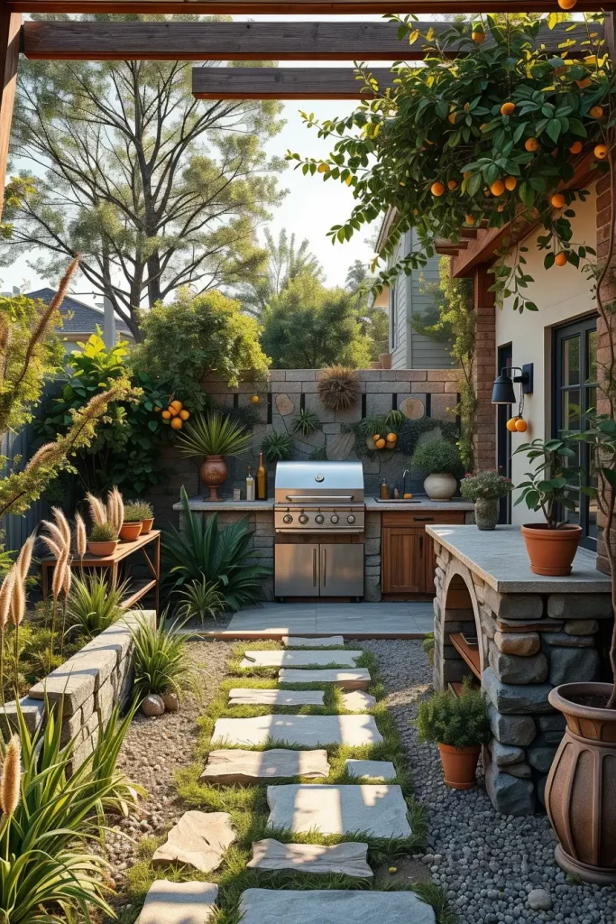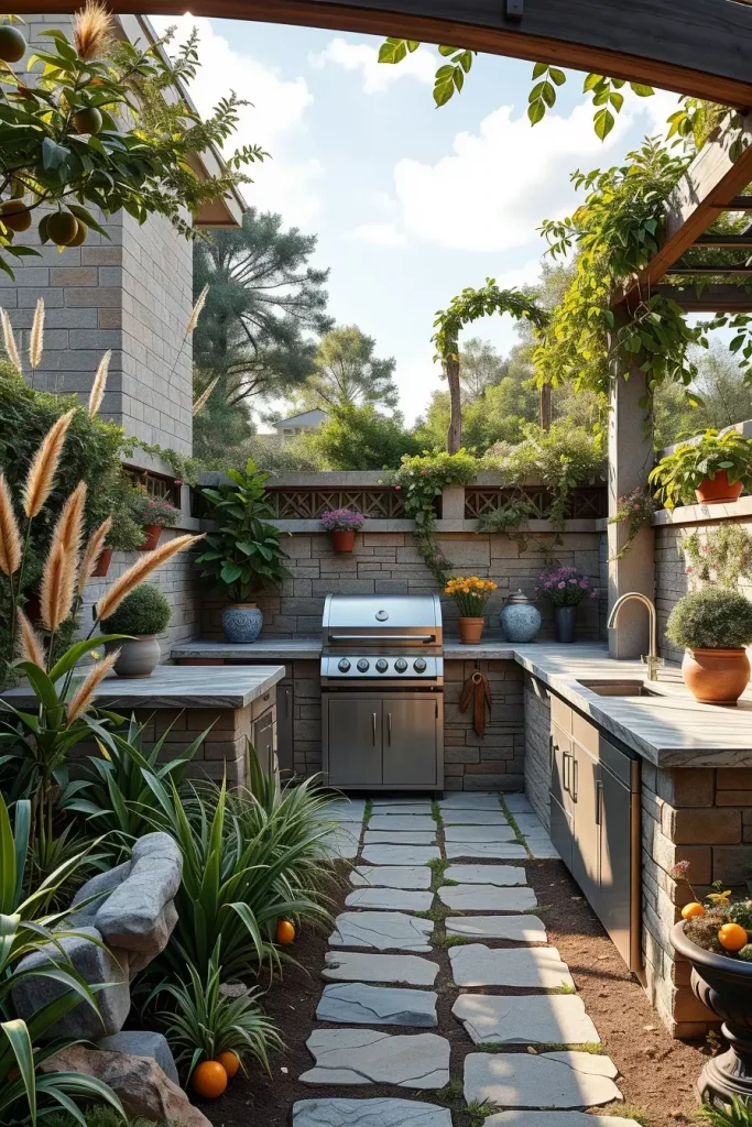 I often use tall ornamental grasses behind the grill wall, low hedges to outline pathways, and potted citrus or olive trees for Mediterranean-inspired projects. Built-in planters constructed from the same material as the countertops ensure continuity. I also incorporate stone pathways leading toward the grill to create a sense of arrival and guide foot traffic logically.