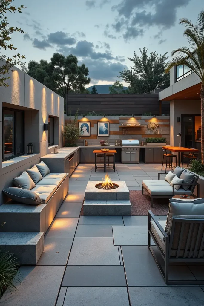 I typically position a built-in grill island as the anchor, with a narrow reflecting pool or minimalist fountain along one edge. Opposite it, a modern gas fire trough in concrete or steel provides warmth and atmosphere. The materials must be cohesive: smooth stone paving, subtle LED lighting beneath water edges, and fire-resistant seating placed at a safe distance. I also integrate non-slip surfaces and concealed drainage systems to maintain safety and longevity.