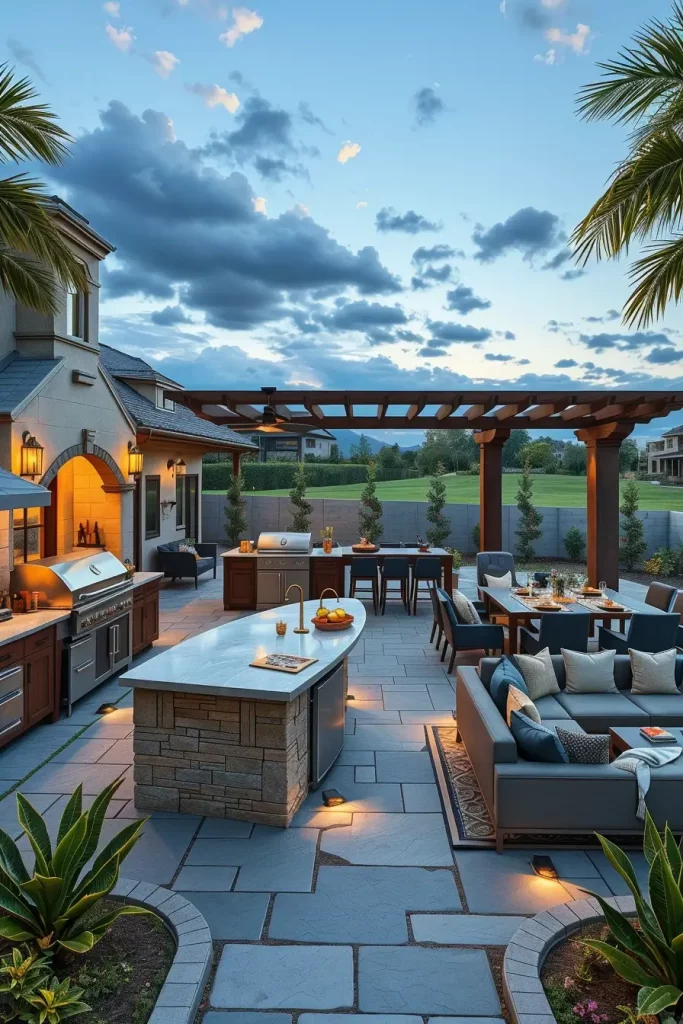 I typically design a generous central island with integrated grill, side burners, and refrigeration. Adjacent to it, I include a secondary prep counter and storage wall to reduce congestion during gatherings. A covered dining pergola with a long communal table anchors the entertaining zone. Materials remain consistent throughout the yard to maintain visual unity, even across large distances.