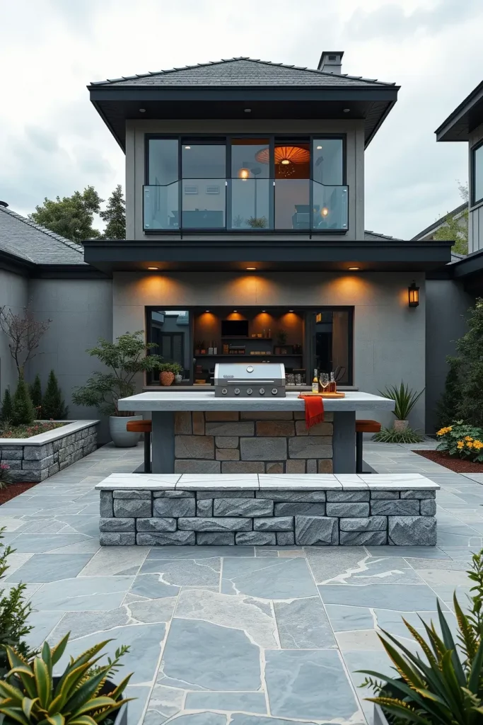 From my perspective, material contrast is what makes a barbecue island truly designer. Elle Decor frequently highlights the importance of mixing tactile surfaces to avoid flat, monotonous spaces. I find that combining raw and refined materials creates visual rhythm and helps the island stand out as a sculptural centerpiece.