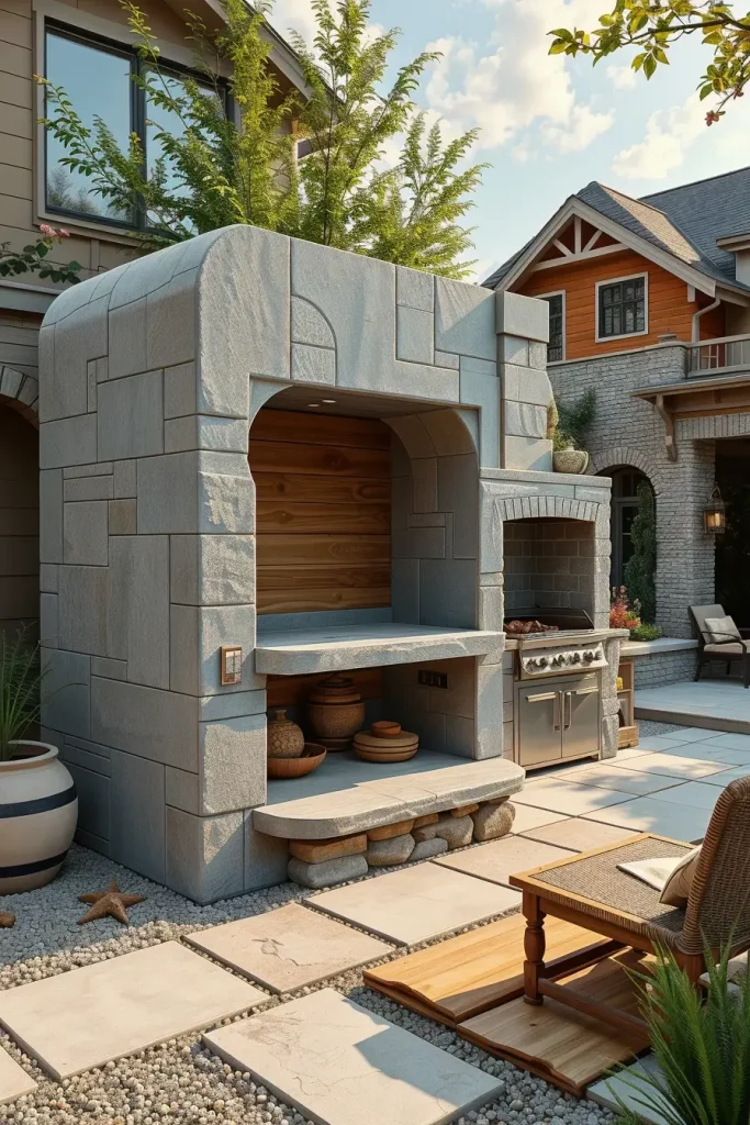 In these installations, I focus on craftsmanship. Cast-in-place concrete can be tinted for warmth, while natural stone blocks add texture and authenticity. I often integrate built-in wood storage niches, recessed shelving, and minimal stainless steel inserts for functionality. Surrounding the structure with gravel, large pavers, or architectural landscaping enhances its sculptural impact.