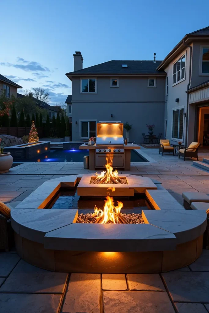 Blending elemental contrasts is one of the most artistic directions in outside barbecue area ideas 2026. I often design spaces where fire and water coexist in harmony around the grill zone. A linear fire feature parallel to a sleek water wall creates visual drama while reinforcing symmetry. These combinations elevate the grill area into a dynamic sensory environment, where movement and reflection add depth to the composition.