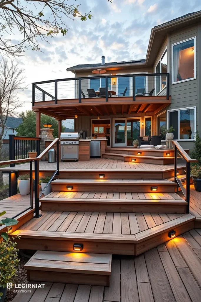 Multi-level decks introduce movement and hierarchy into outside barbecue area ideas 2026. I use elevation changes to define purpose: the grill on one level, dining on another, and lounge seating slightly below or above. This creates visual interest and improves functional organization. Instead of walls, the change in height naturally separates activities while preserving openness.