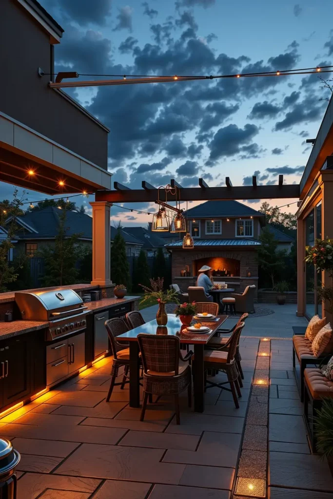 I usually install recessed LED strips beneath countertops, pendant lights above dining tables, and subtle ground lights along pathways. Wall-mounted sconces or integrated pergola lighting emphasize vertical lines. I prefer warm color temperatures to enhance the natural tones of wood and stone. Smart lighting systems allow adjustment of brightness depending on the occasion, from lively gatherings to intimate dinners.