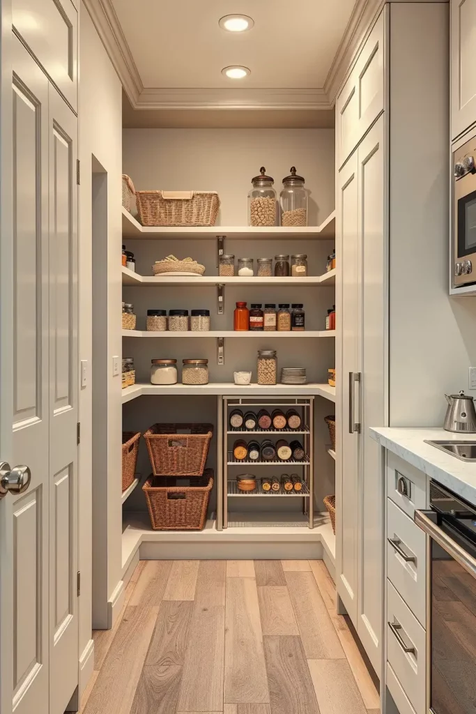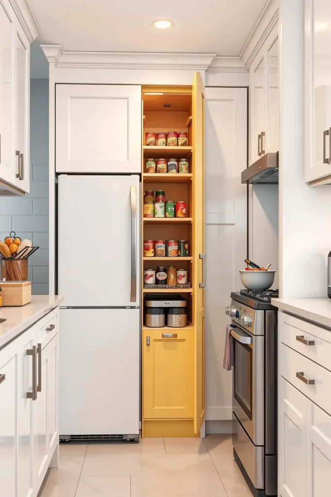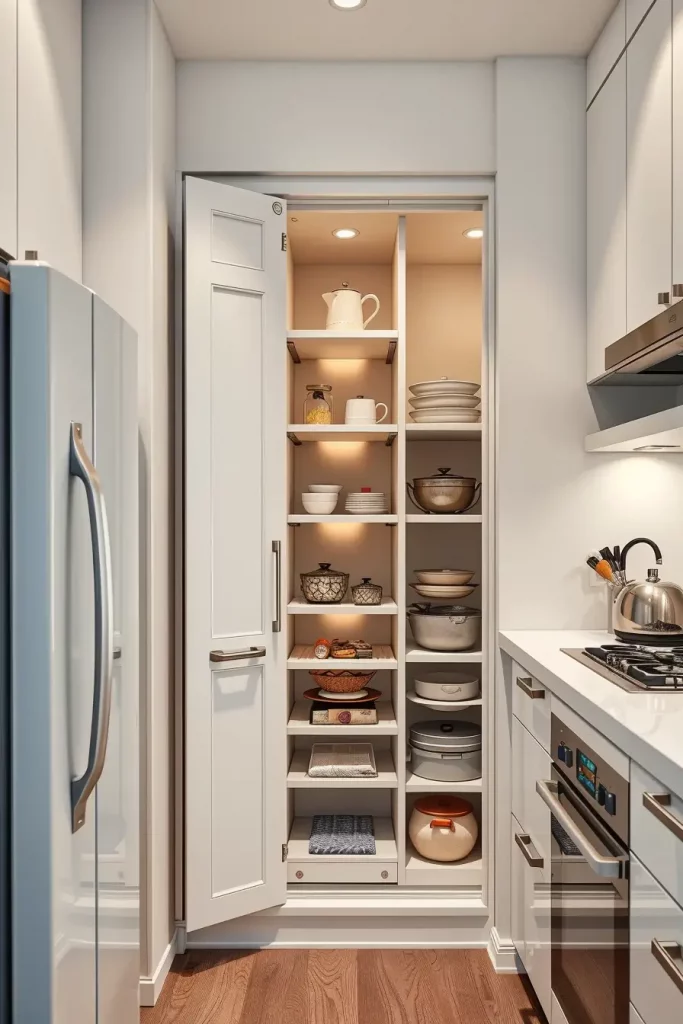 Expanding on this thought you could add upper mounted shelves above the slim pantry for seasonal or bulk storage to keep the main area accessible for day to day items.