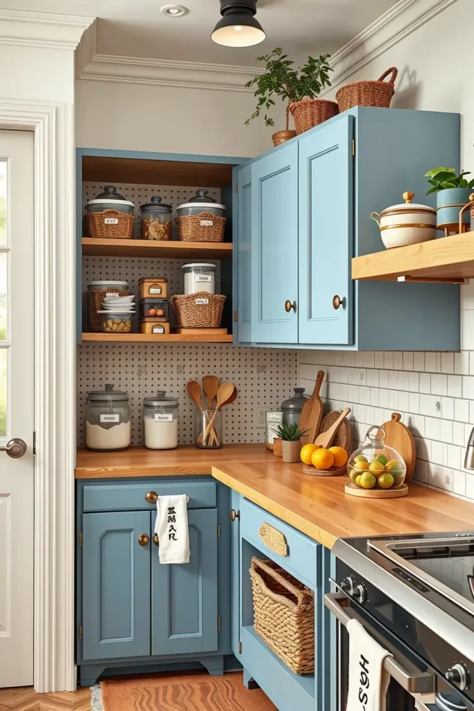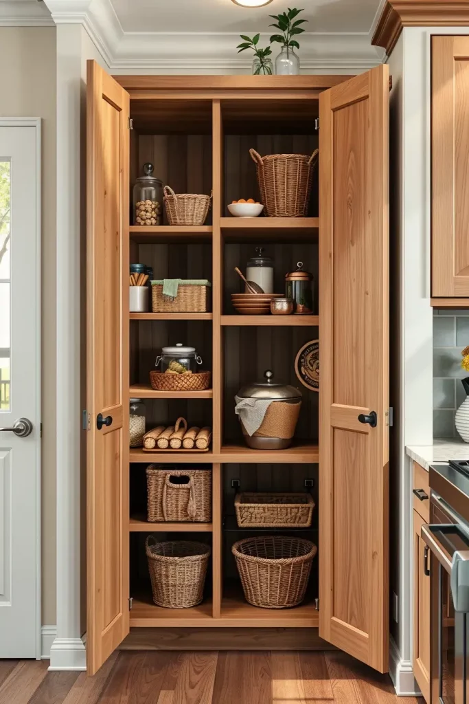 Pantry cabinets with built-in baskets and crates bring texture and warmth and good sorting ability into small kitchen spaces. I find this arrangement very useful particularly when there are narrow cabinets to fill small spaces. Baskets help group similar items and are perfect for storing onions, snacks, or packaged goods that don’t stack well.