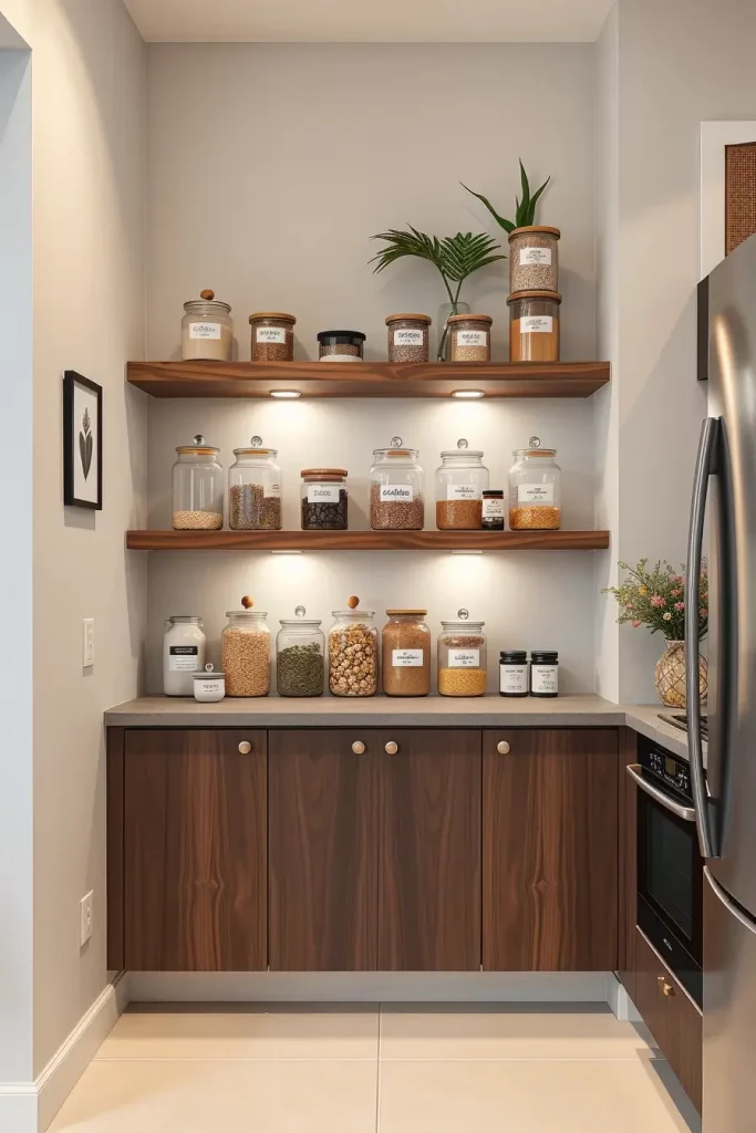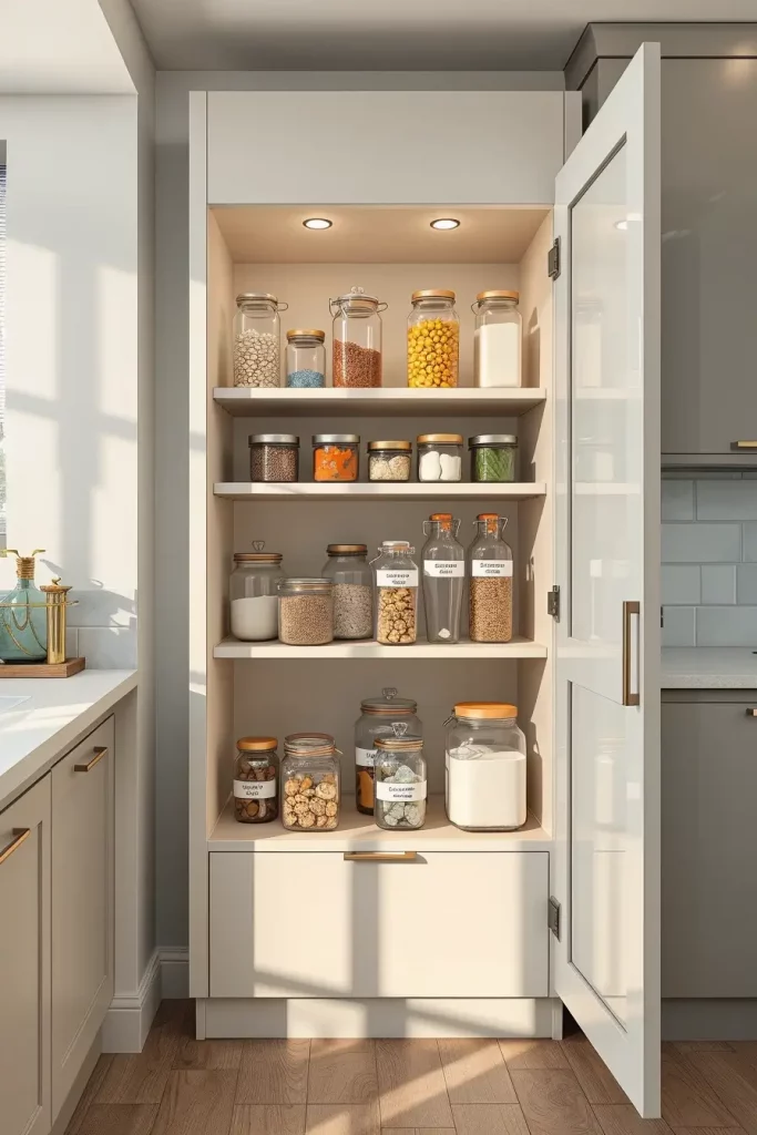 Clear containers are a necessity to shallow pantry cabinets, as they create uniformity and visibility and make the area feel less crowded. In my projects, I regularly observe simple shallow pantries in small kitchens being inefficiently used because people stack mismatching packaging. Transparent bins and jars make the struggling guesswork passé and establish visual order.