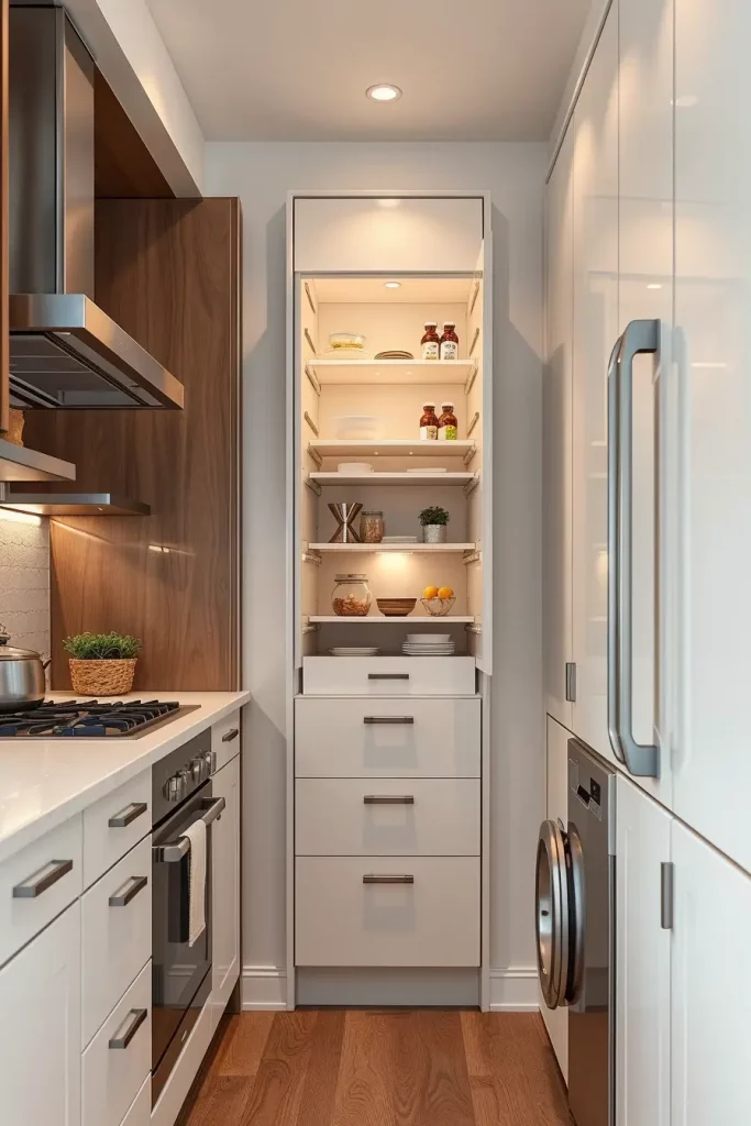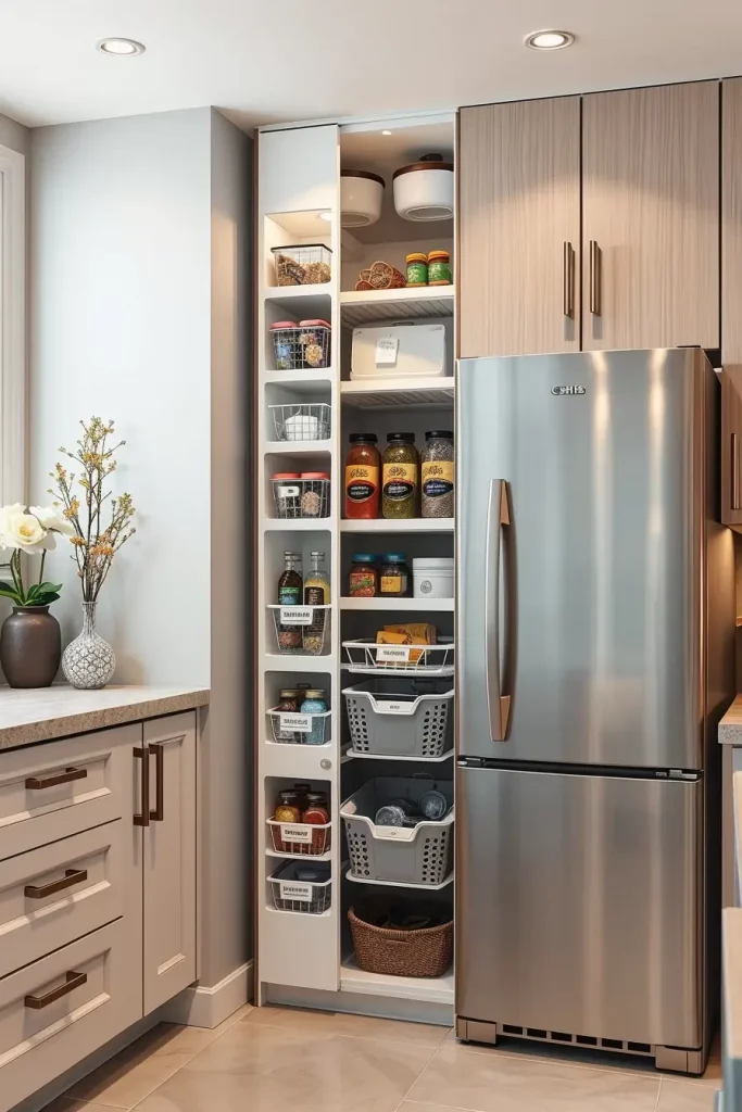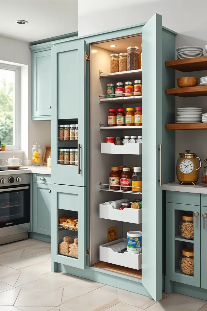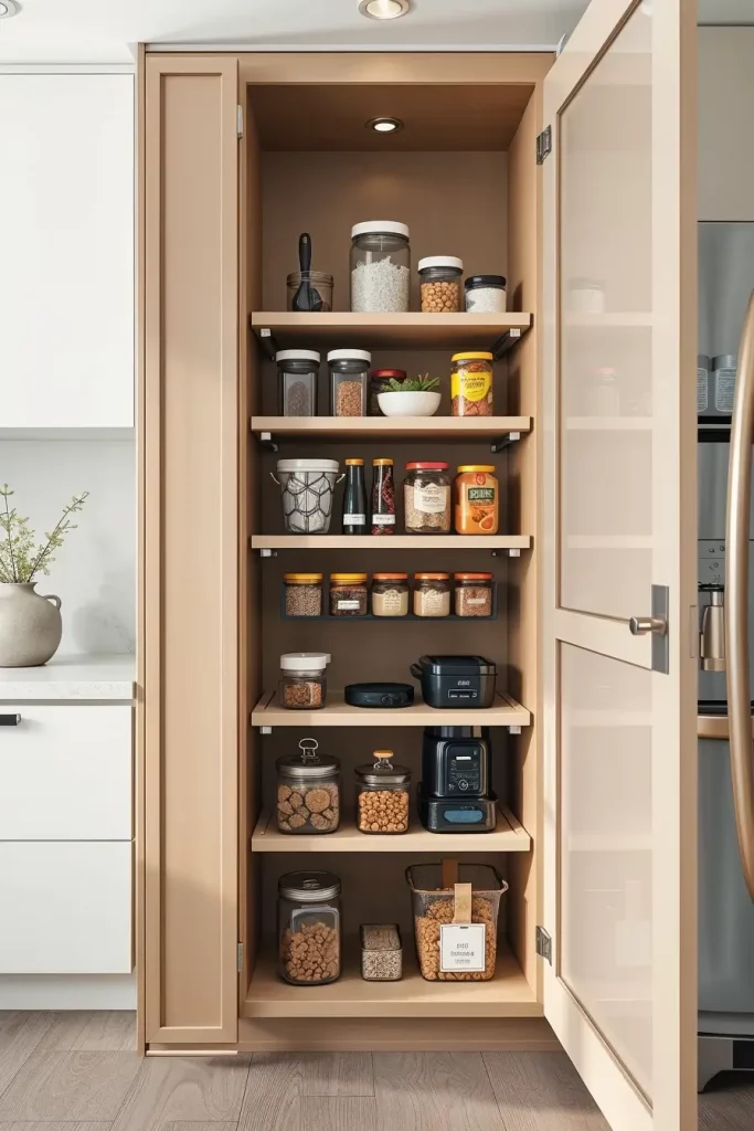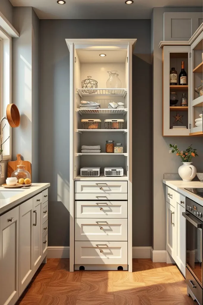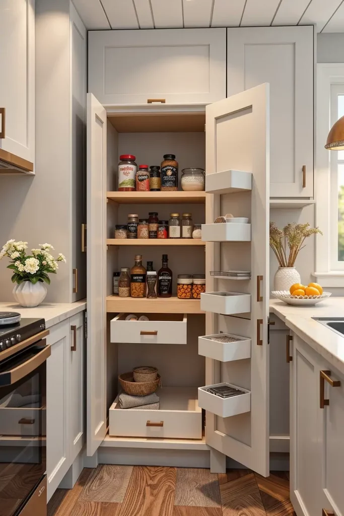 A slim floor-to-ceiling cabinet with flat panel doors in neutral shade such as sand, white or sage makes for a clean visual line. I would rather have open shelving inside the cabinet and used labeled baskets or glass jars so that everything is organized and easily retrievable. Functional drawers at the base can be fitted to softly close to conceal storage. A vertical spice rack put into an inside of one door is an excellent way to make the best use of every inch.
