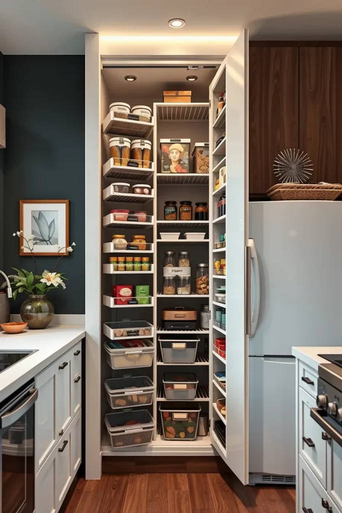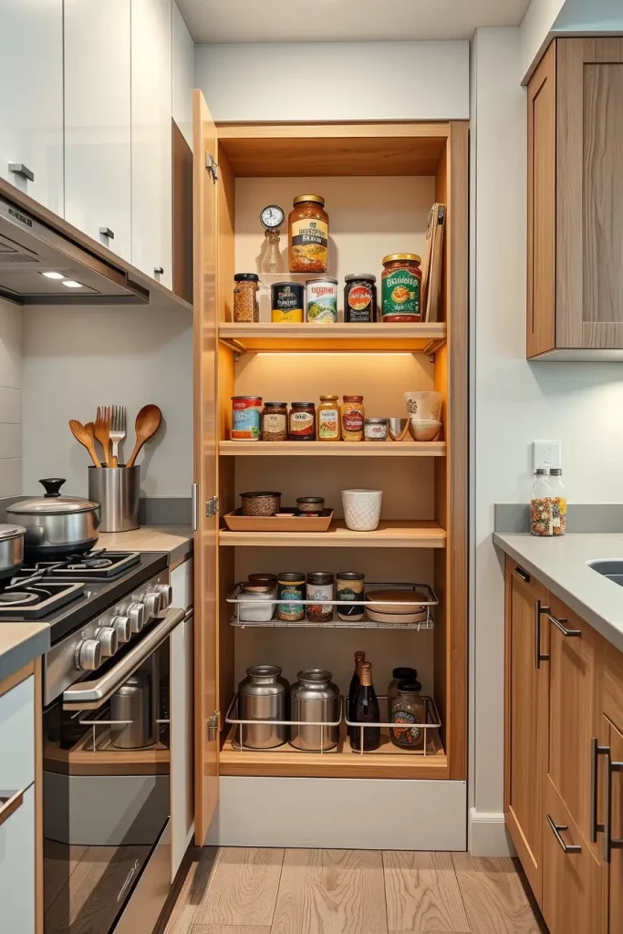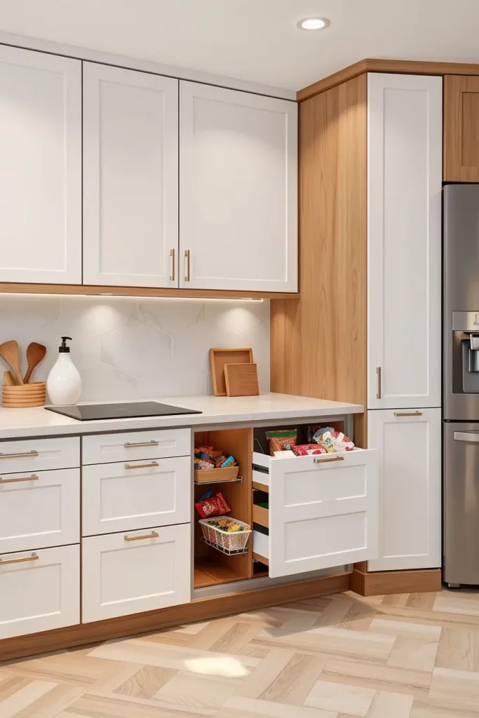 Pull-out pantry drawers are a smart idea for small kitchens pantry storage. These usually hide in bits of unused space like the space between the oven and the wall and they make everything easy to access while reducing visual clutter. What I love most is that these drawers take away the necessity for reaching down or reaching deep into a dark cabinet.