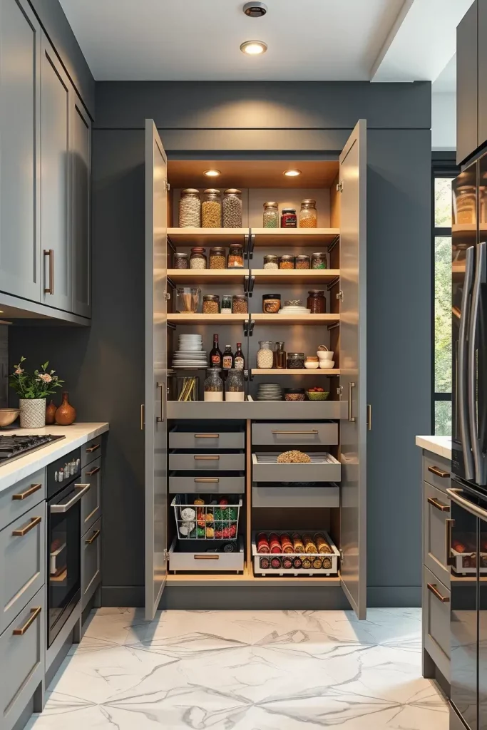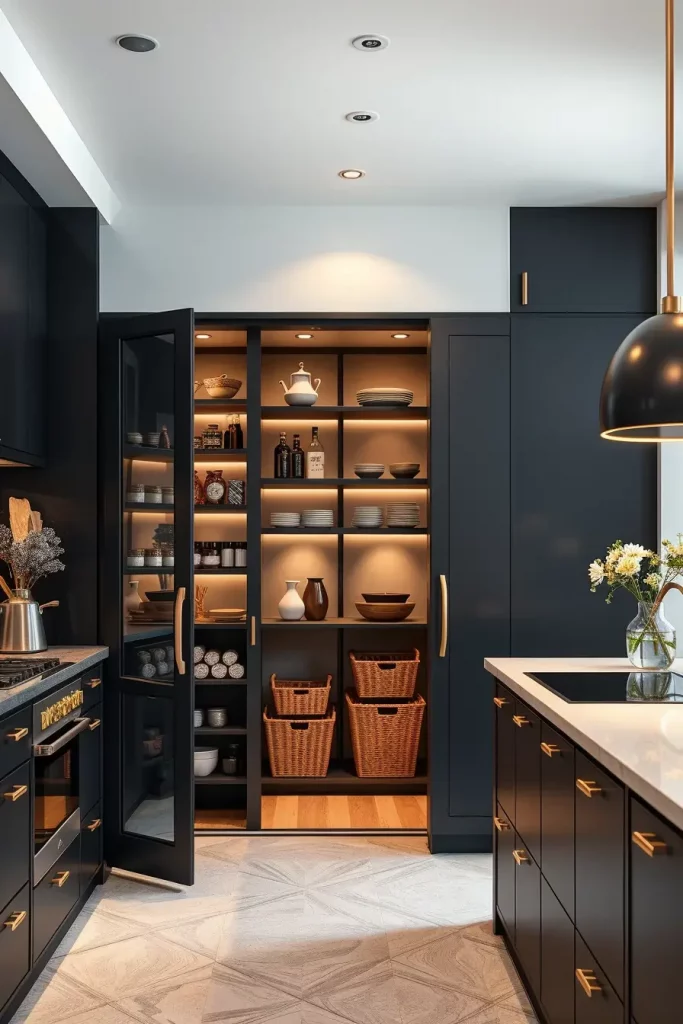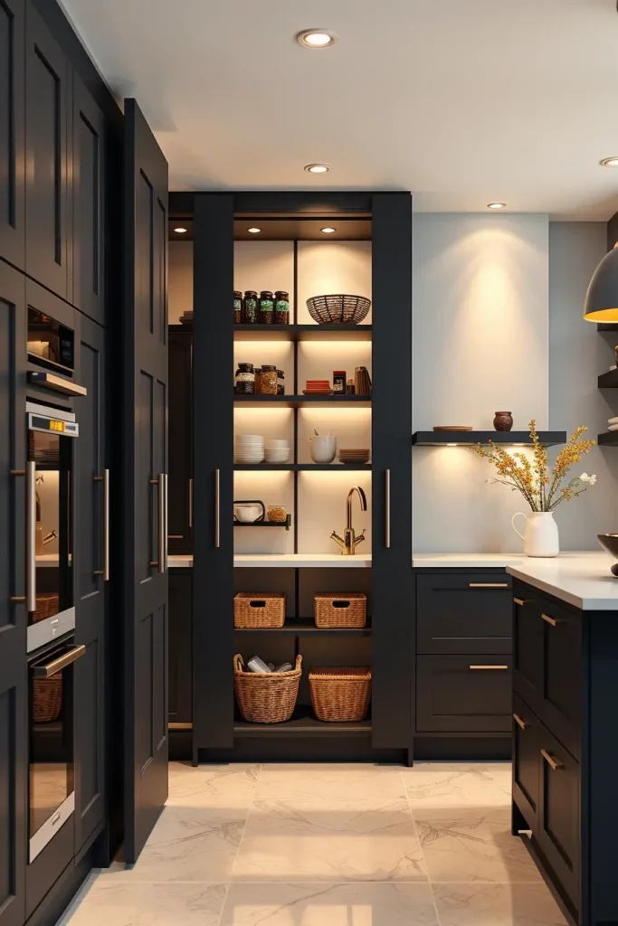 A good configuration is to have a high cabinet in matte black or soft beige with pull out wire shelves and adjustable sections. The interior is even able to be divided into spaces for spices, dry goods, and even cleaning equipment. I tend to match these with modular boxes for storage that is neat. The cabinet is best and should ideally be freestanding or recessed in to a shallow alcove. Location of it close to the entrance of the kitchen ensures a harmonious flow without spoiling the room’s design harmony.
