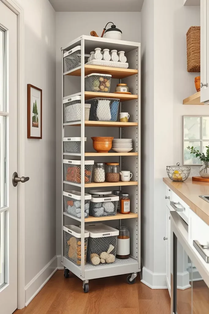 Rolling pantry cabinets are saviors for dynamic, small kitchens. They are portable; slim, and extremely versatile. I often suggest this design to clients with apartments or shared houses where flexibility as well as compactness matter a lot. These cabinets can be squeezed in small areas or rolled out when cooking food.