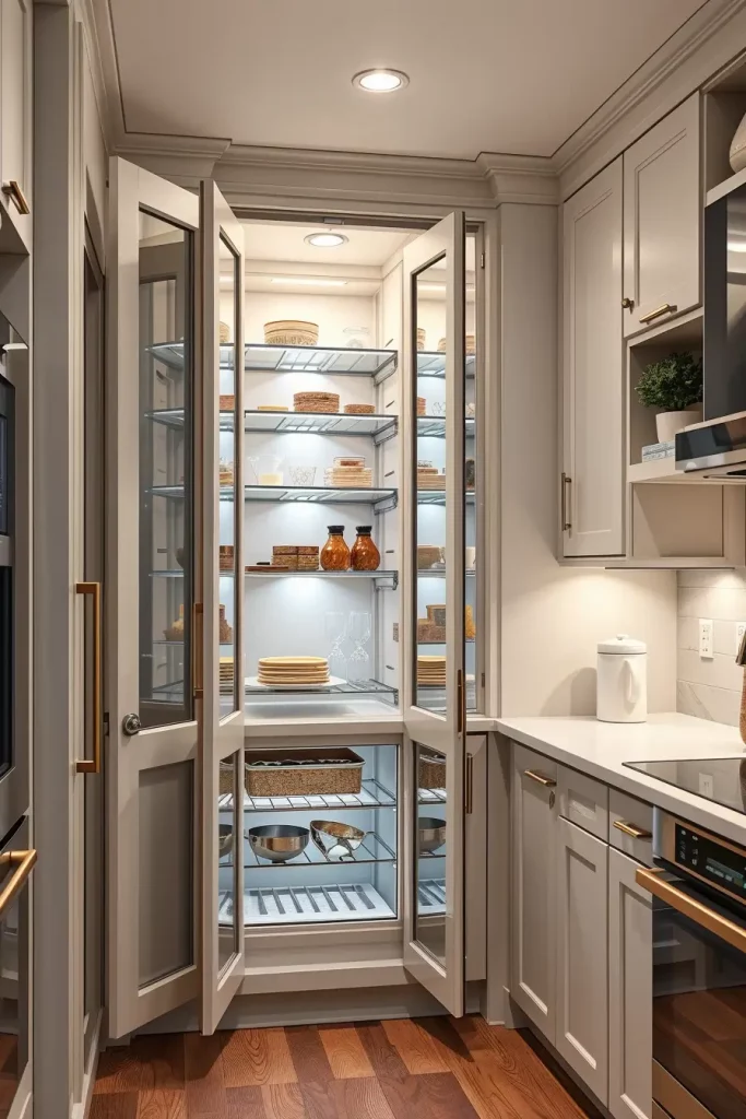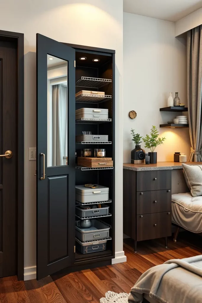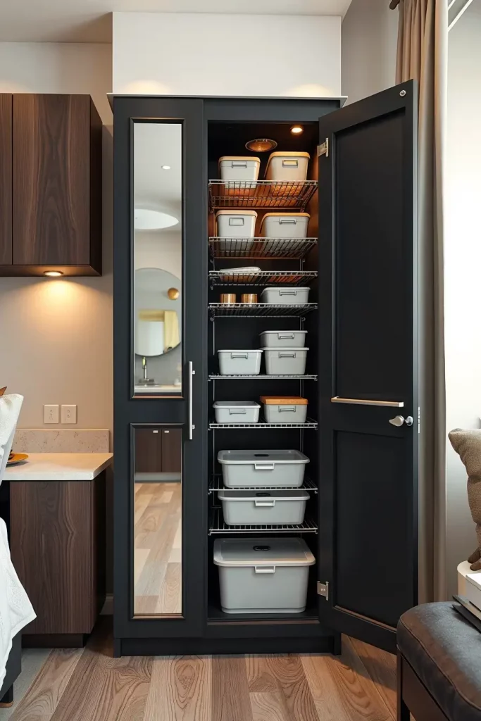 Based on my work with micro apartments, adding mirrors or reflective panels near the doors of the pantry improve light and make the room feel bigger. As suggested by Elle Decor, mirrored finishes are a rock-bottom underused small-apartment hack that brings depth without extra furniture.