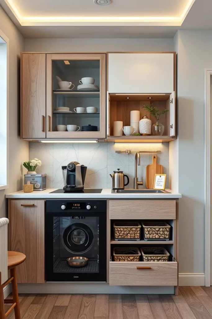Where every square foot of space matters in a tight layout, a pantry cabinet which can also serve as a coffee bar is an appropriate harmonious combination of form and function. With one compact set up, you can store dry goods as well as mugs and small appliances, and establish designated morning ritual area. In small spaces, combining multiple uses in a single cabinet is not just a trend—it’s a necessity.