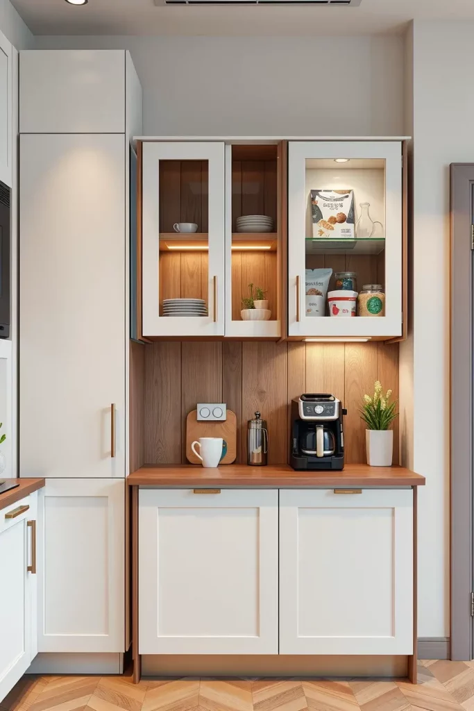 I advise beginning with a cabinet beginning at the floor up to the ceiling, whose color is matte white or woodgrain to prolong the sight of the wall. The upper portion can have glass doors to showcase mugs or baskets while the lower will have drawers or roll-out trays for dry things. A draw-out counter in the centre offers counter space for a coffee machine / kettle with hooks mirroring either side for accessories such as a scoop or spoon. Soft lighting of LED can be installed beneath the shelf for aesthetics and practicality.
