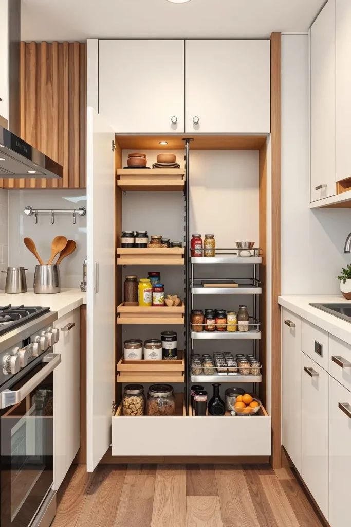 I tend to install vertical pull out drawers in metal or wood with smooth gliders and side rails for stability. Such units commonly comprise tiered wire racks or slimmer wooden trays perfect for keeping spices, canned goods or even oils and baking supplies in place. They are usually integrated with already existing cabinetry making them disappear when not in use. Completing the face of the drawer to fit your surrounding cabinets maintains consistency in the aesthetic.
