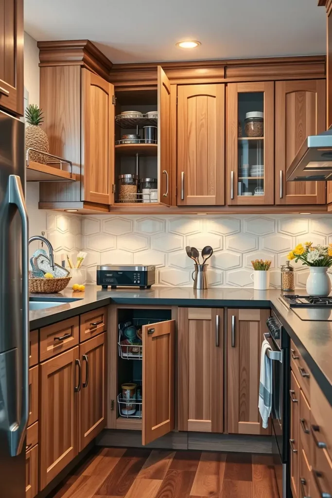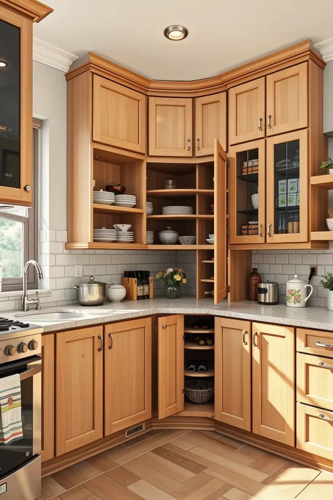 I usually recommend things with L planting-placement with tiered inner shelving, turntables, or sliding mechanisms for accessing things at the back. Corner cabinets with glass doors or angled fronts also contribute to creating a feel of opened space. Choosing floor-to-ceiling height is crucial to maximizing every inch.