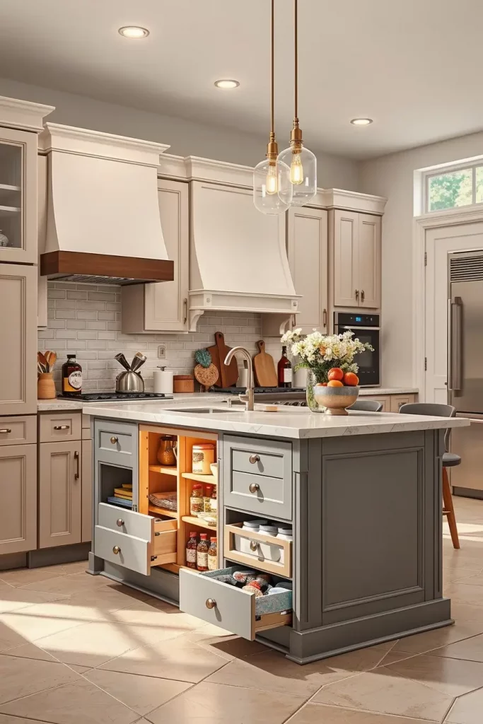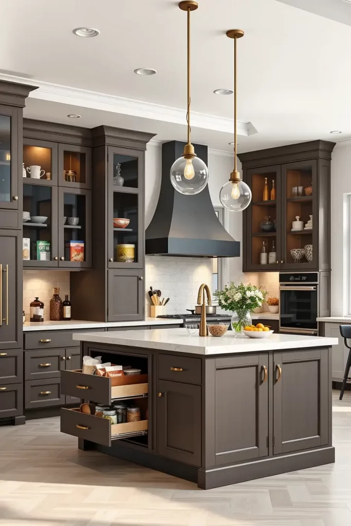 Even soft-close cabinet doors on the non-seating side of the island can hide the hidden pantry. For larger dry goods like cereal boxes I like to use deep drawers, and shallower drawers for spices/snacks. This arrangement of the kitchen space reduces reliance on wall cabinets and clears up the visual field and makes the kitchen appear bigger. The drawers have integrated lighting giving an elegant modern touch.