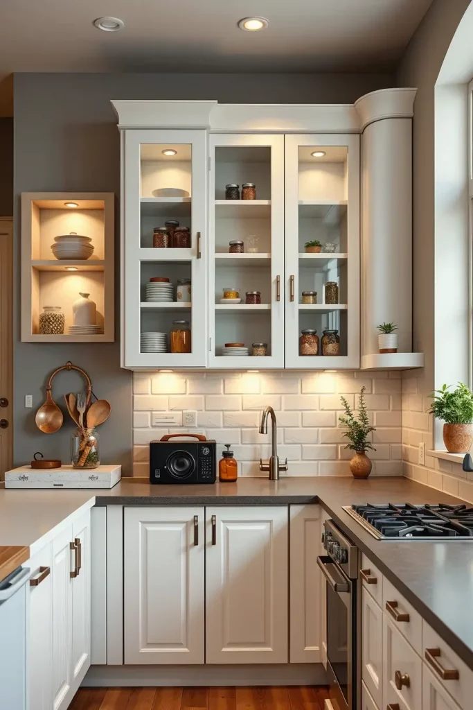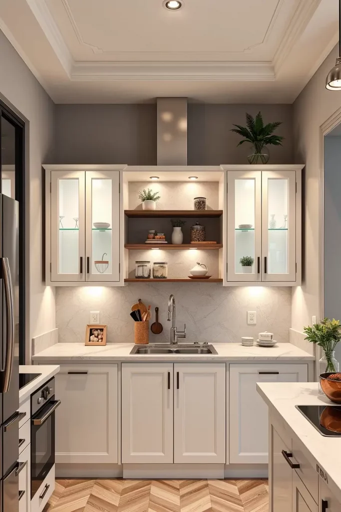 I tend to use cabinets with glass fronts or open shelving to prevent a closed up feeling. Slate white or light gray finishes are best to reflect the natural light sources and to make the kitchen feel bigger. Internally, typically the shelving is not deep and this facilitates efficient organization and retrieval of ordinary pantry items. Wall-mounted cabinets are also pretty when used together with accent lighting that gives not only function but ambiance as well.