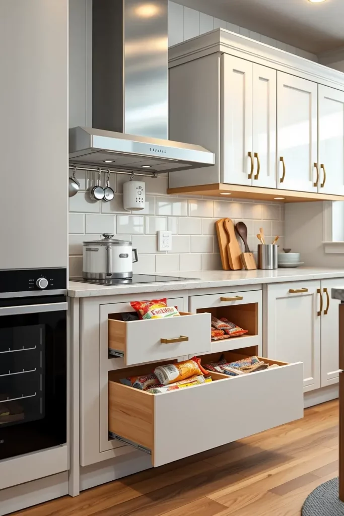 Ever so slightly forgotten, underneath the kitchen cabinets lie a first class piece of property for under-cabinet pantry drawers. I often suggest this solution when there’s no way to grow outwards or upwards. Able to fit flat items on the pantry shelves, such as cutting boards, wraps, baking sheets, or snack packs, these drawers are a great place to store flat items from the pantry. Their low ranking provides such a low profile for items that they are out of sight but easily accessible.