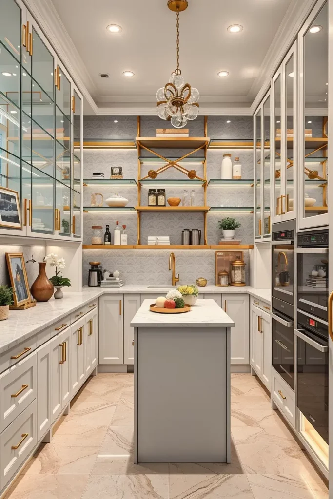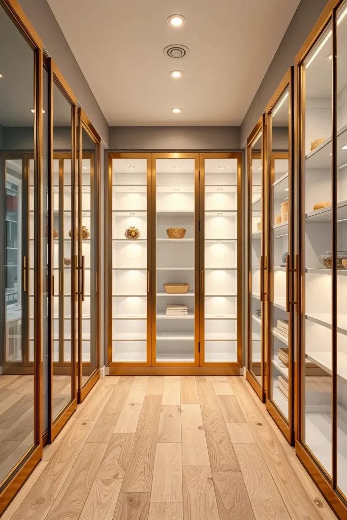 I always select tempered or textured glass for this type of interior due to its added safety and gentle concealment. The metallic accents, particularly the brushed gold or stainless steel, have a warm luxurious feel. Alongside minimalist open shelving and lighter walls, the entire pantry feels sophisticated and considered. This form of entry is not only useful but improves the overall space as well.