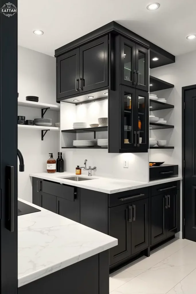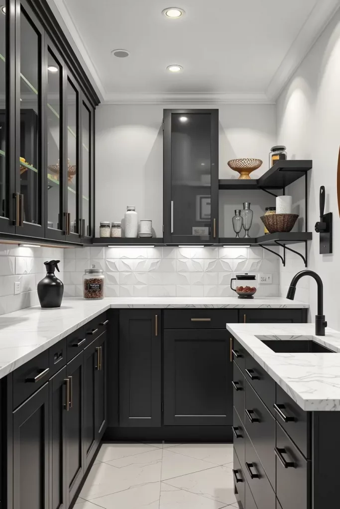 In these designs, I tend to combine white walls or shelving and matte black cabinetry, or the opposite. Countertop selection is also a consideration, and I use honed quartz or solid surface ones in either black or white to match. Decor is garnished with black cabinet hardware, black side frames around glass doors, monochrome tiles on the splash, and all these do the contrasting and overbearing patterns and colors.