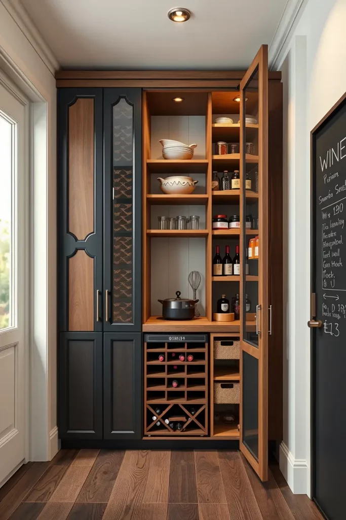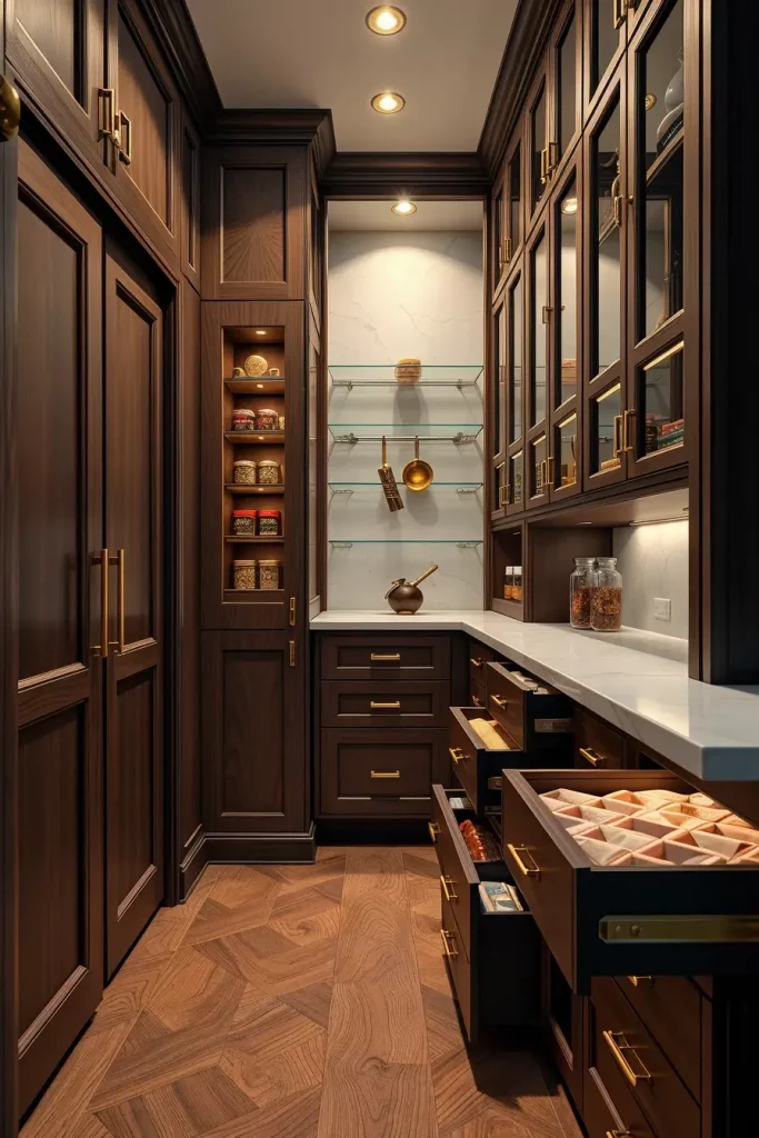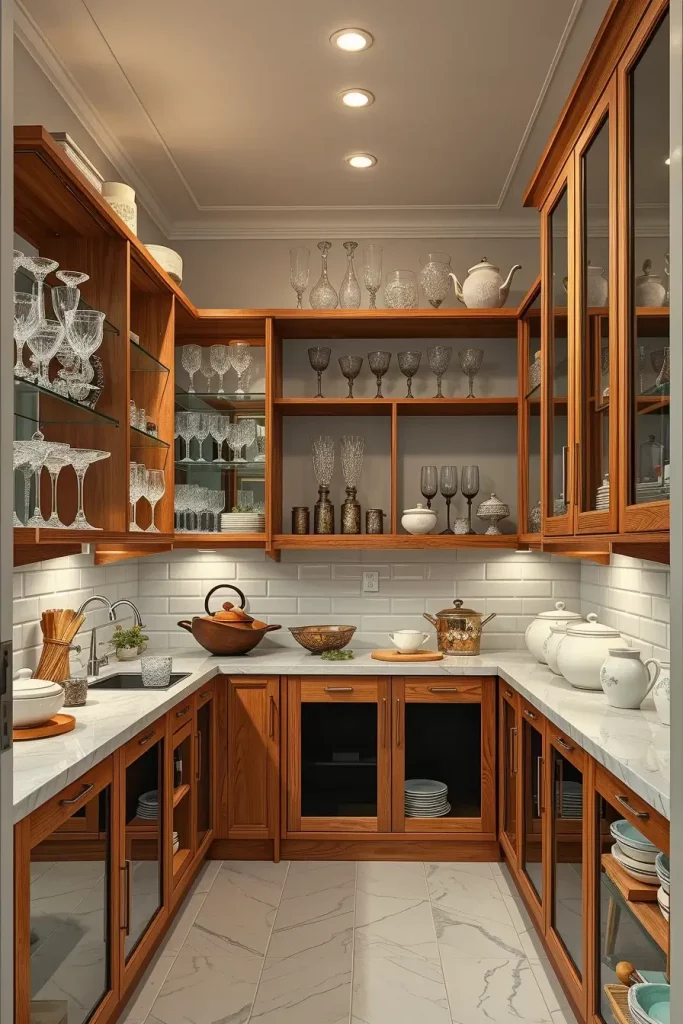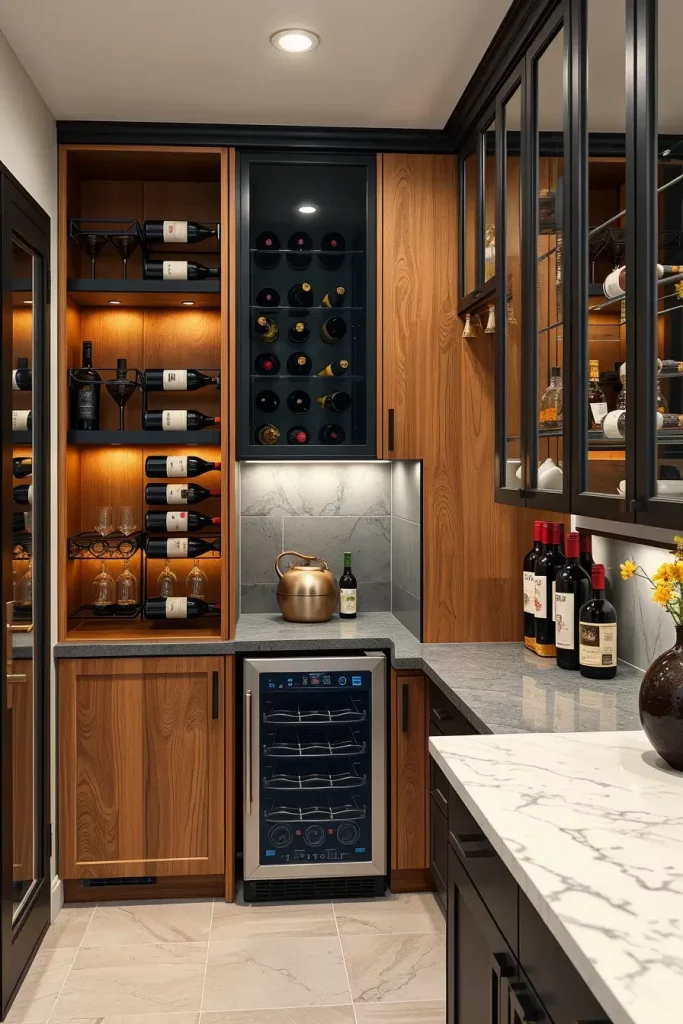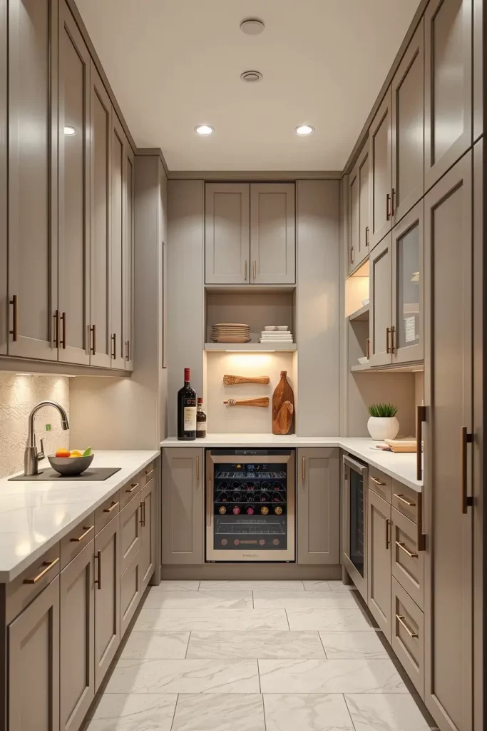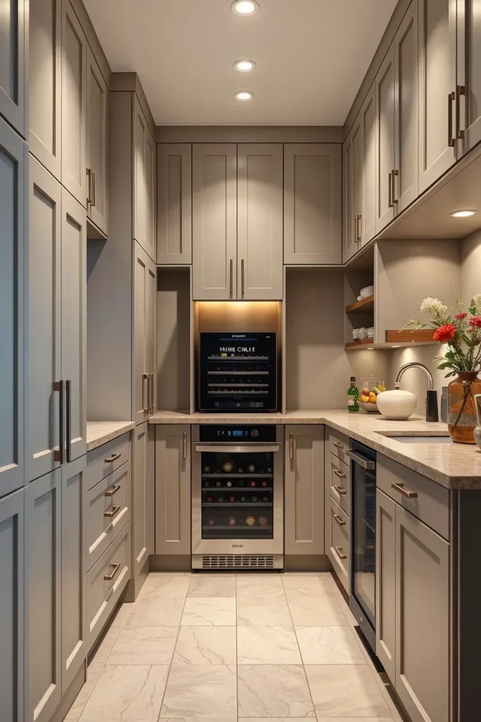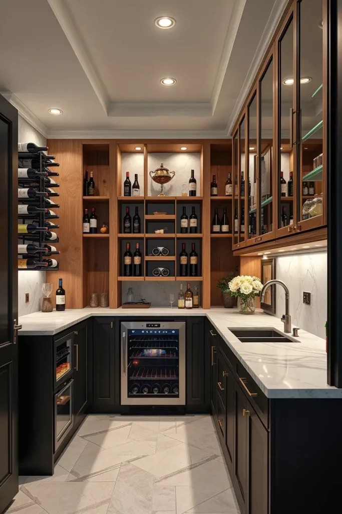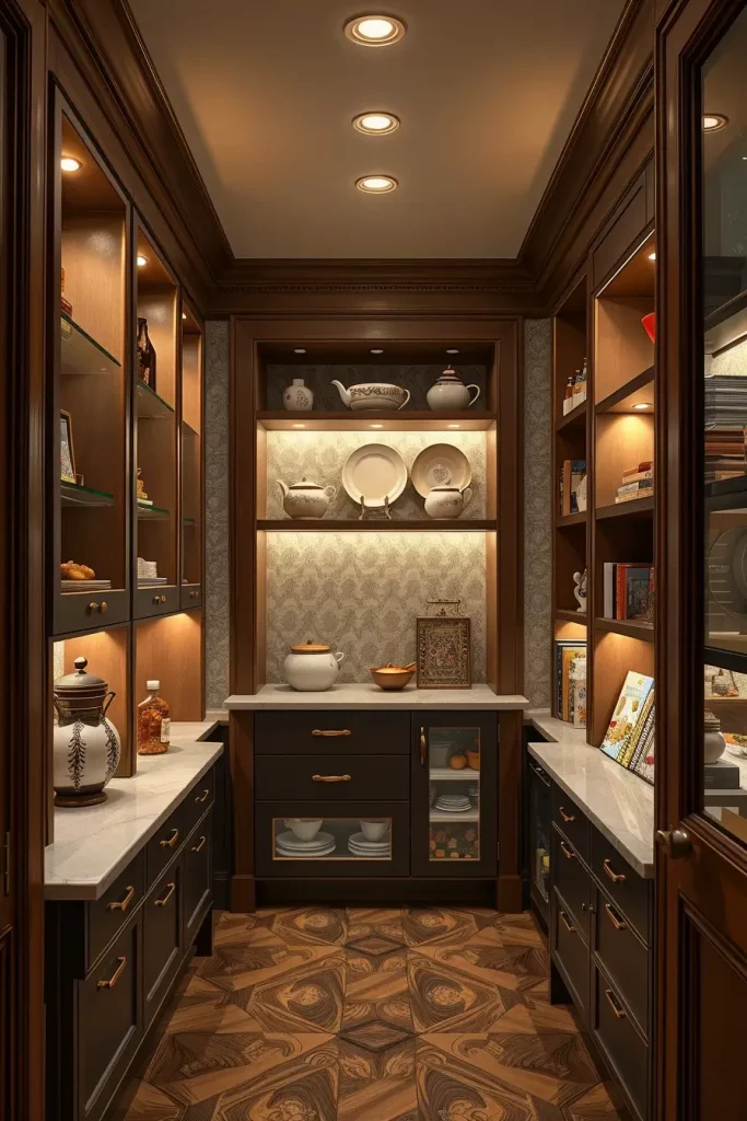 If I were to build on this design, glass decanters and polished trays would make a stunning addition to a mini bar setup. It makes the pantry multifunctional and transforms the space into an entertainment zone.