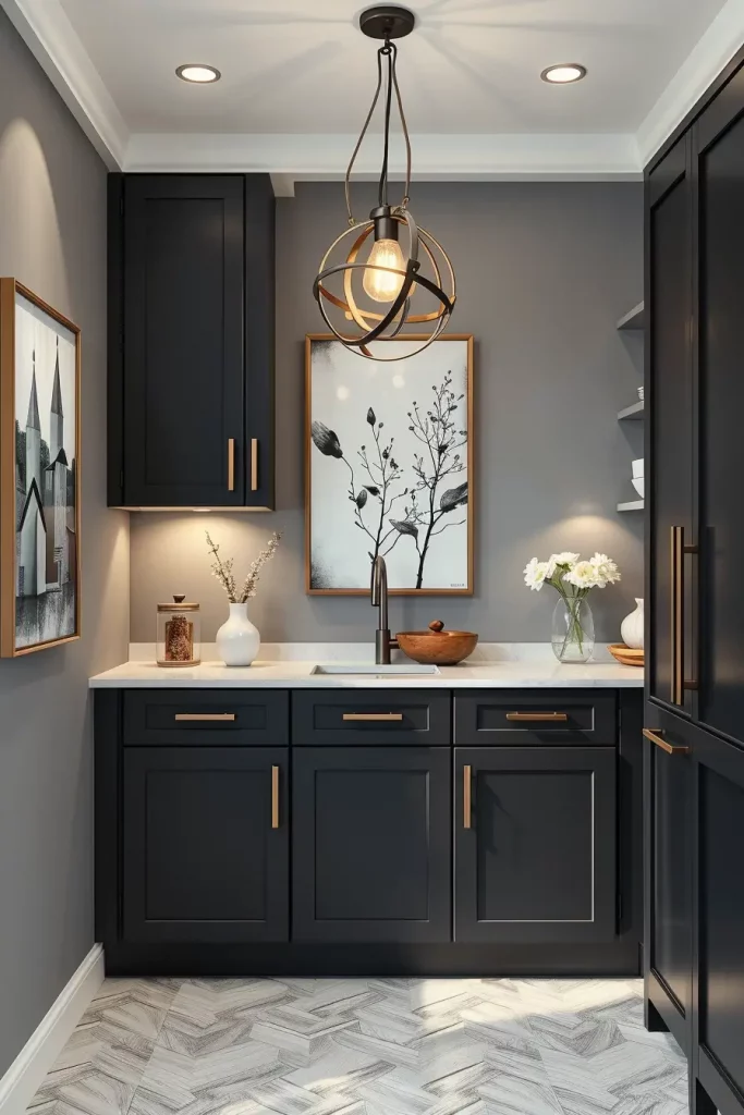 As a rule, less is more. I did a pantry makeover where dark gray shaker cabinets were used with a white quartz slab for the countertop plus three grayscale art prints one wall directly faced a window. Everything felt smoothly streamlined. AD also claims the same colors within a compact space is easier and calmer to perceive allowing the user to feel subtle smoothness and calm energy washing over them.