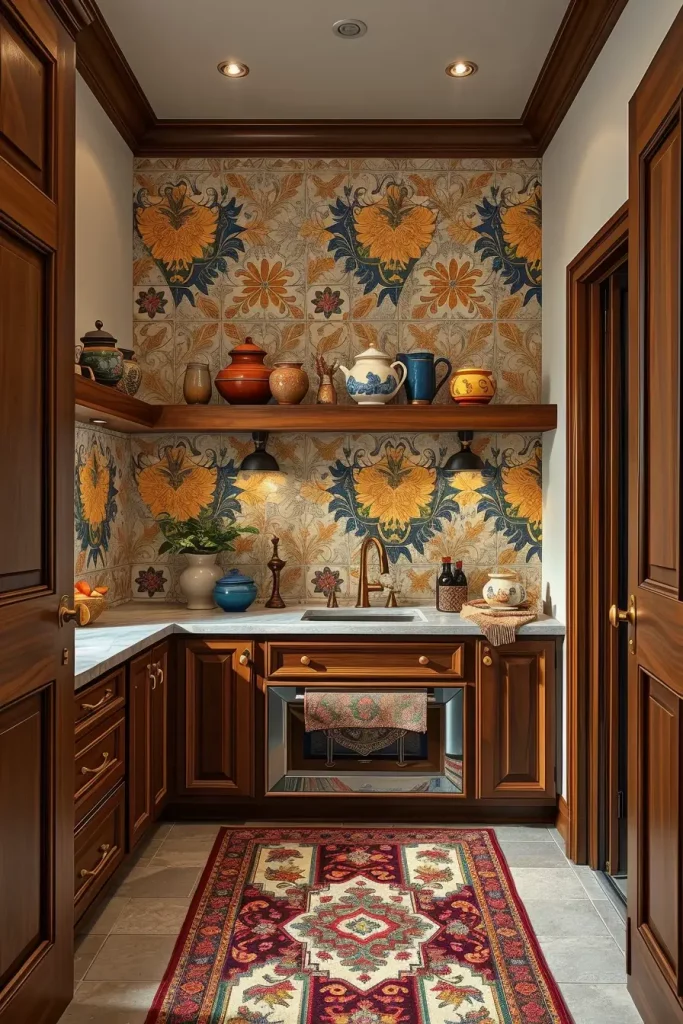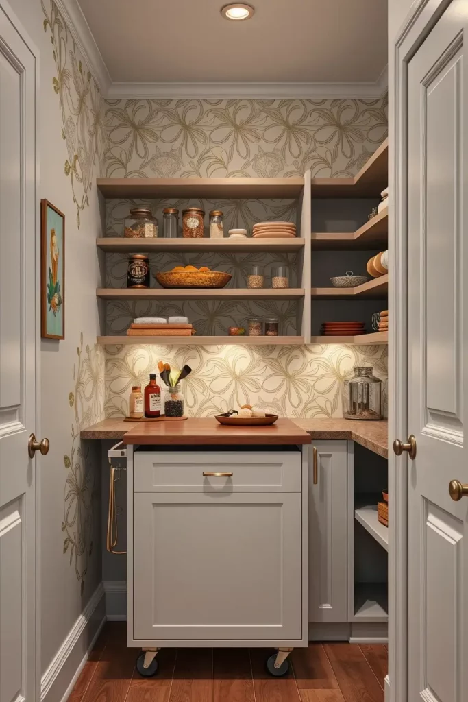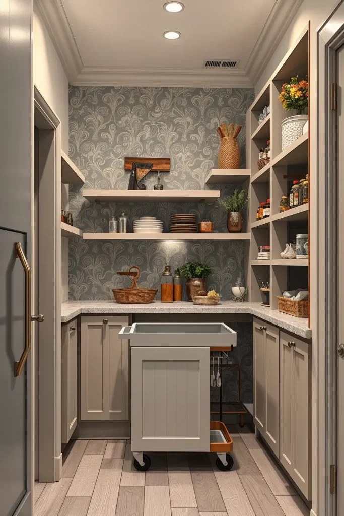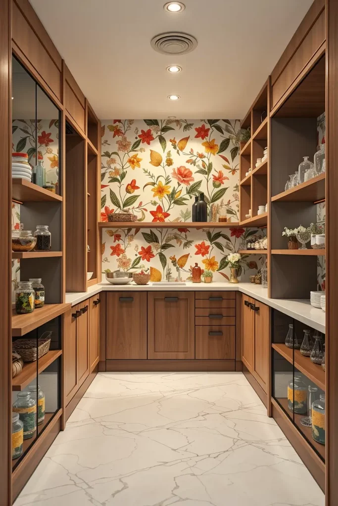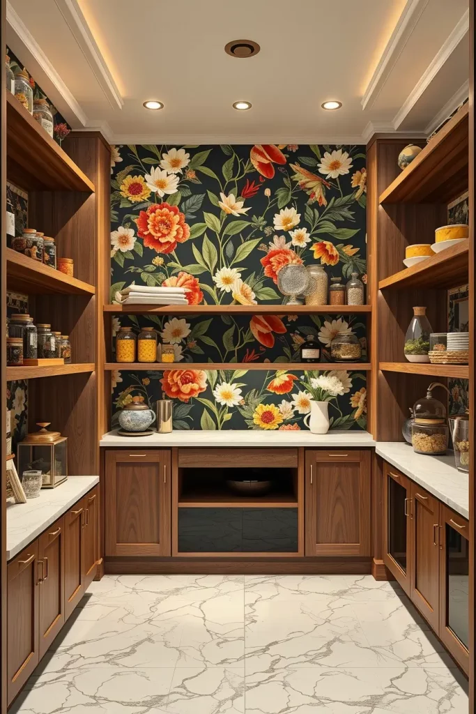 A wonderful approach to infuse creativity and character in your pantry is adding a statement wallpaper. It can be placed without infringing on the functional space of the pantry. When I worked with a client who wanted the pantry to feel like a hidden jewel box, rich in personality but still practical, I tried this approach. When there is not enough furniture, the addition of wallpaper can change the mood of the room completely, especially when combined with sleek surfaces.