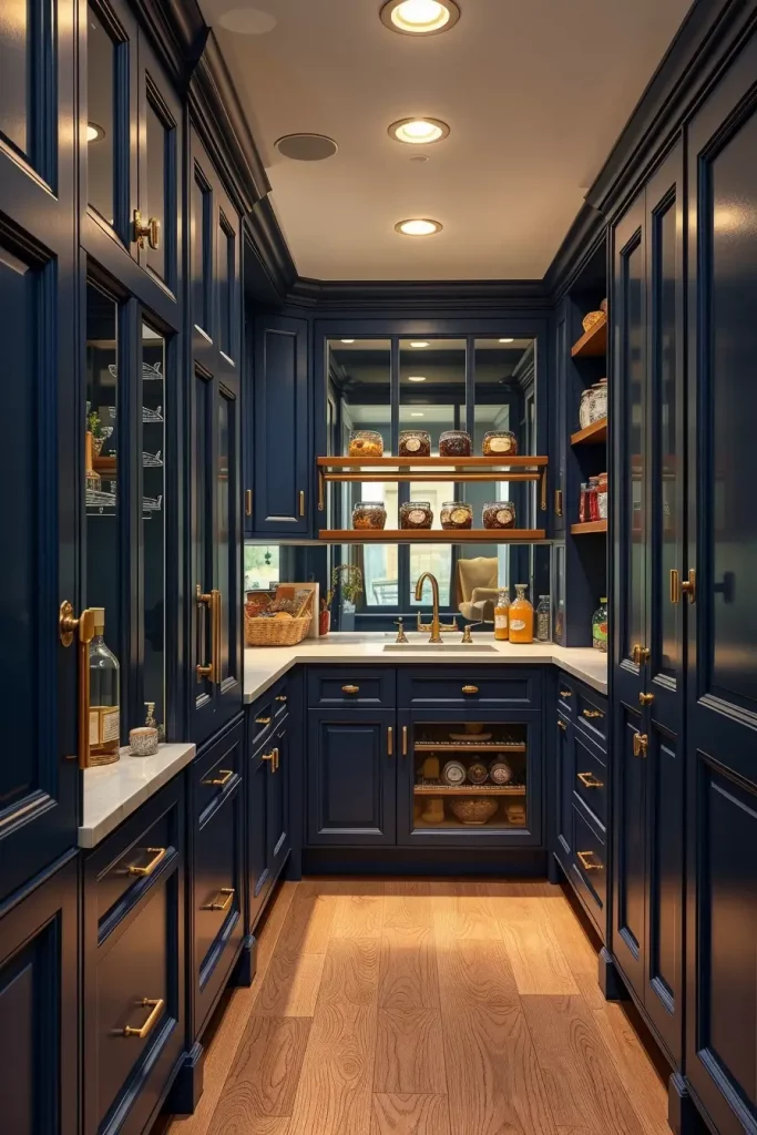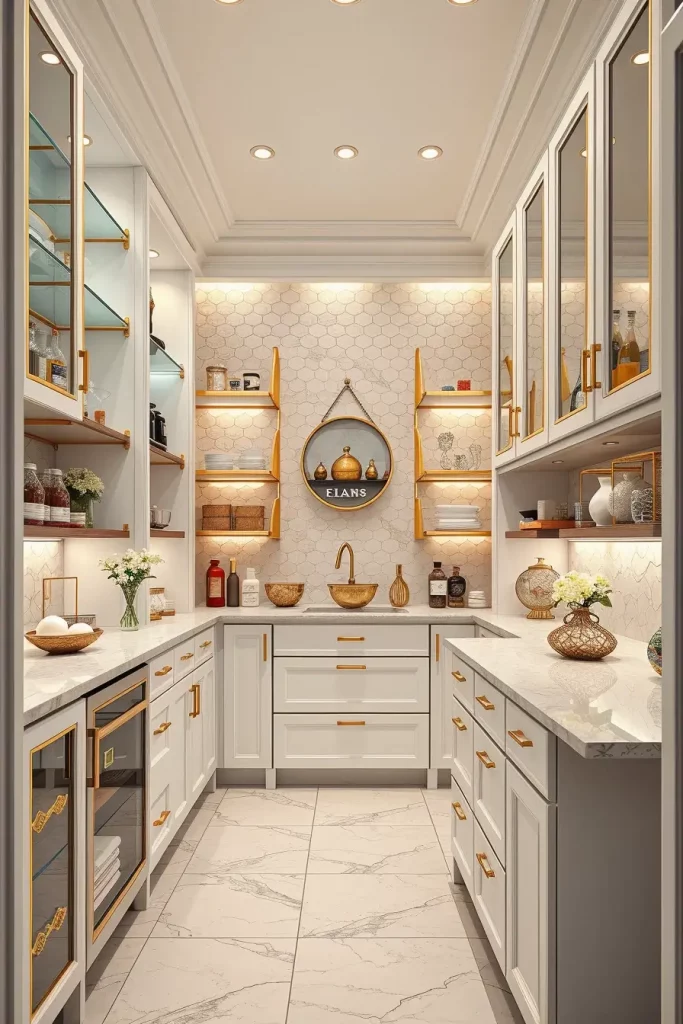 Walk in pantries with gold trim and accent lighting encapsulate modern luxury. I love using this idea where there’s dedicated space in the home for the pantry room, as I could design it like a boutique. The glow from the gold detailing is soft, yet eye-catching, and the lighting used has both functional and aesthetic purpose.