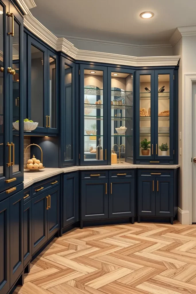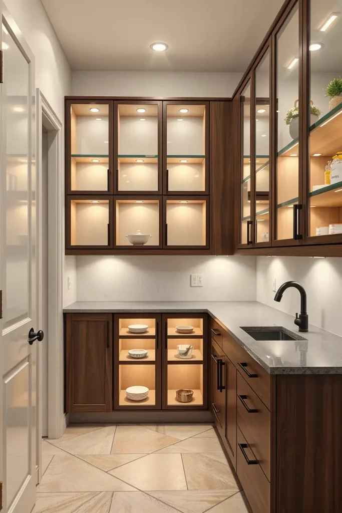 To complement this suggestion, I would propose the addition of soft LED strip lighting placed inside the pantry which would reflect off the glass, creating a subtle and intentional glow that enhances the pantry’s design.