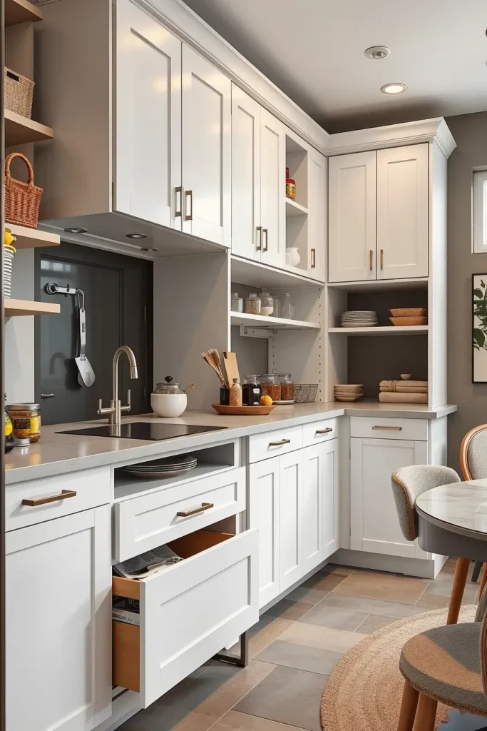 A compact corner pantry is a wonderful piece of interior architecture designed for small houses or apartments as it has an efficient storage solution without compromising on elegance. My favorite is designing corner units with triangular shelving and creative uses of vertical space to maximize what otherwise would be dead zones. It complements the kitchen’s space constraints and complements open-concept kitchens.