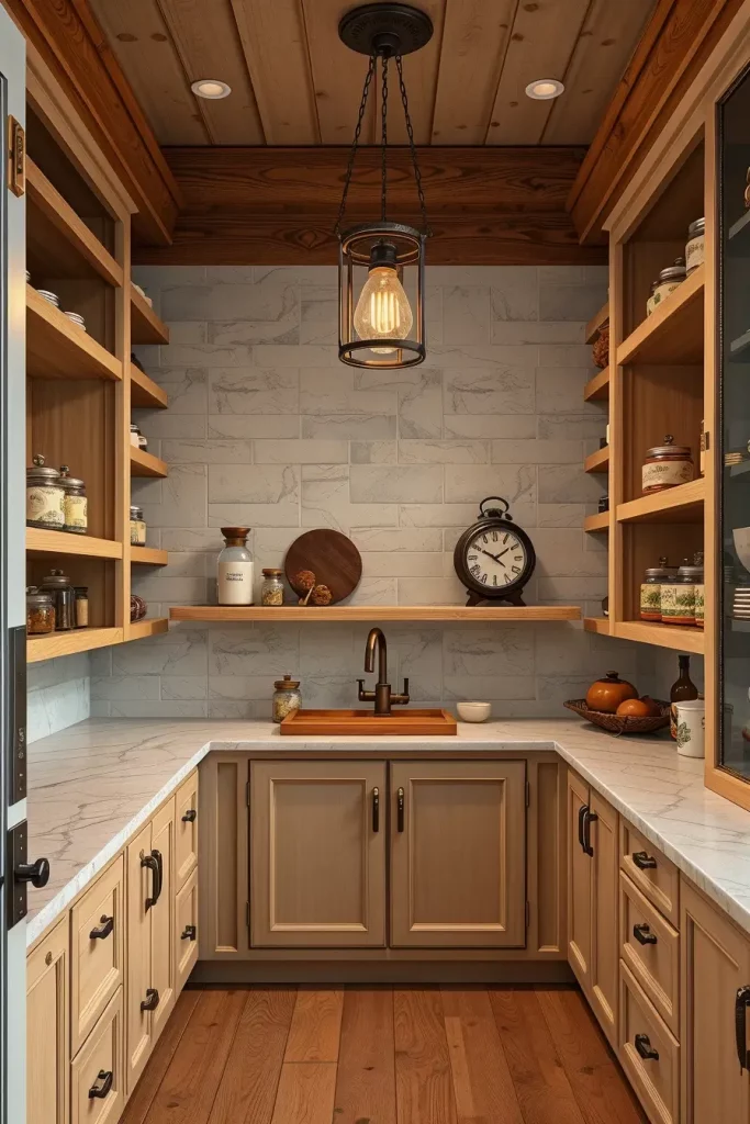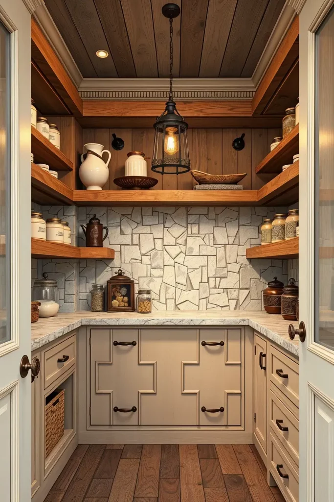 Natural wood brings unparalleled warmth when used in the construction of pantries. The added detail of a stone backsplash is ageless. The combination of elements creates a space with warmth, something I value deeply. This design embraces natural, textured tones which is excellent for rustic or transitional homes.