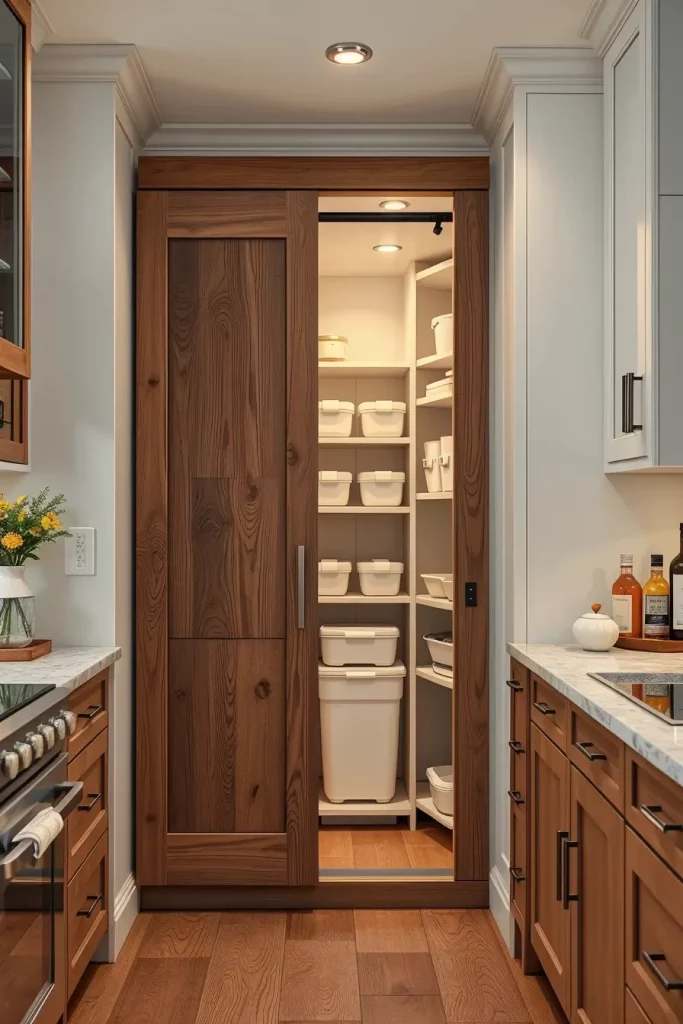 A hidden pantry kept behind custom sliding panels is perhaps the most surprising and impressive of all pantry room ideas. It’s a concept I enjoy using to ensure the aesthetic of an open kitchen or dining room is kept intact without showing the functional storage space situated off to the side.