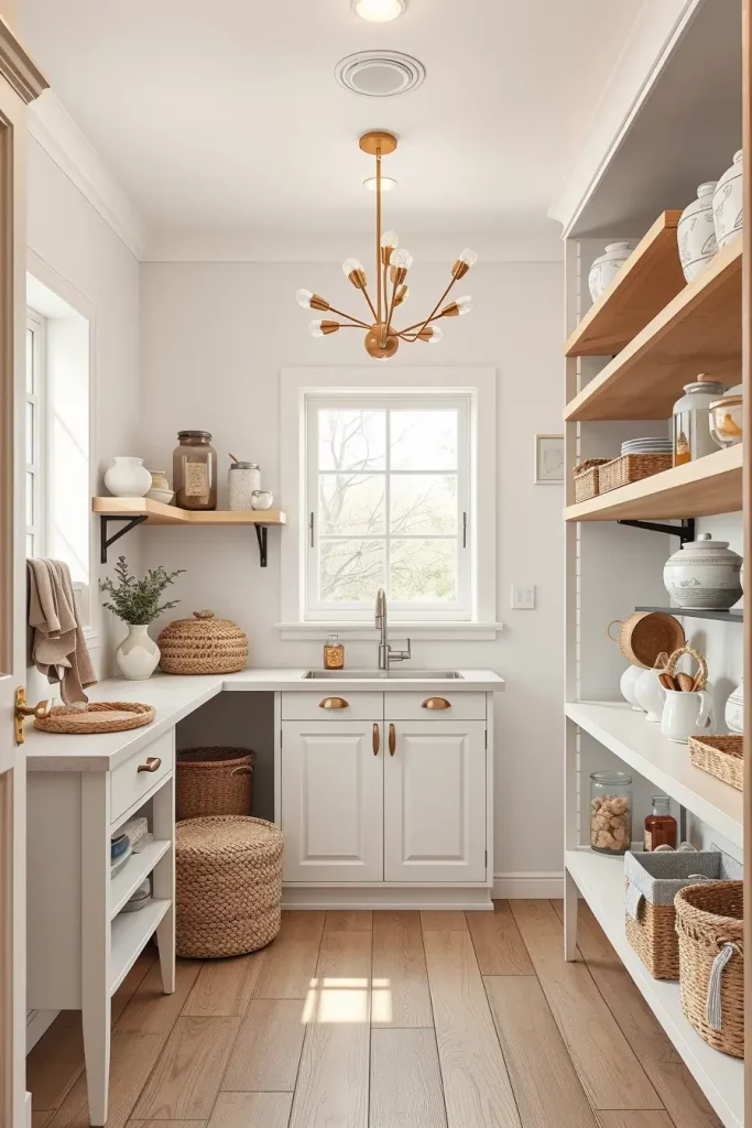 An enhancement I would propose for this part of the text is incorporating ceiling-hung pot racks or vertical herb gardens that make use of sunlight for growth, creating a beautiful functional pantry.