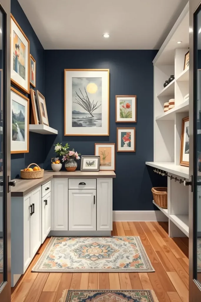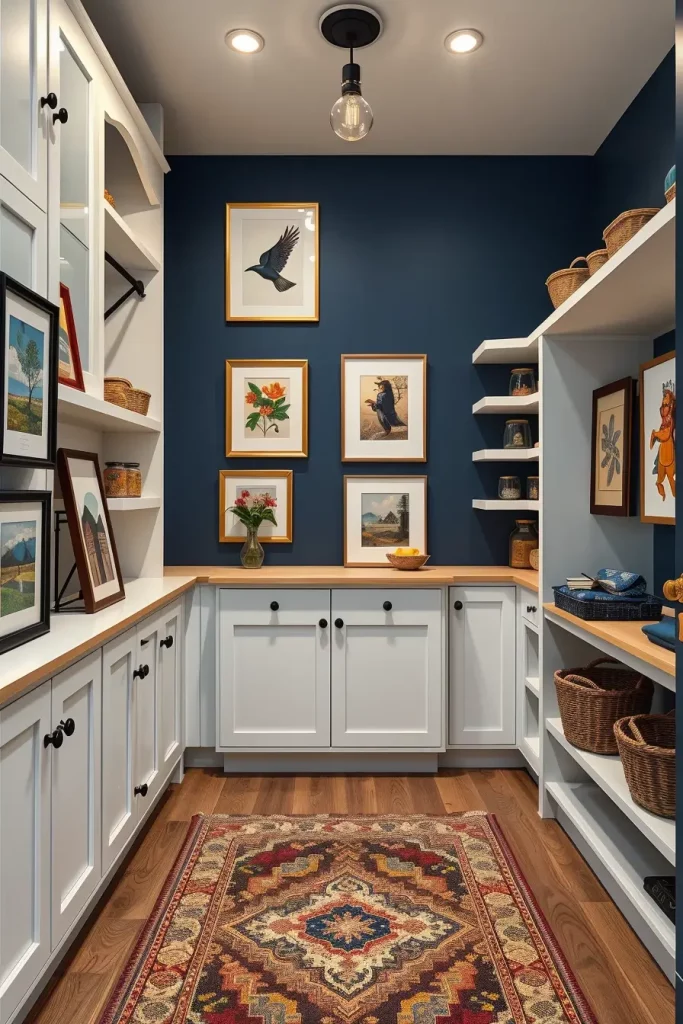 Putting an artistic display in a pantry room is certainly out of the box. In certain upscale residences or design-centric settings, I advise utilizing one wall of a pantry as a display gallery of sorts. Be it a collection of printed vintage food advertisements or small sculptural pieces, this idea certainly does imbue character and elevates the pantry form beyond a mere storage space.