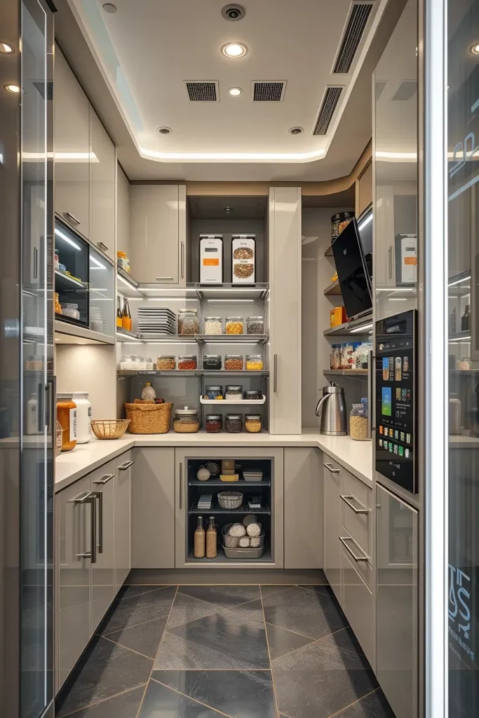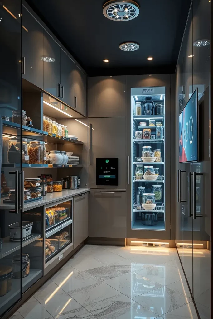 For all cabinets and shelves, I include linear LED strip lighting with laser motion activation that turns on with the opening of the pantry door. Here, the color scheme is uniform high-gloss gray or taupe cabinetry, integrated stainless steel shelves, and glass canisters with their labels visible. A built in smart display on the wall for digital grocery lists and recipe access is also something I adore to include.
